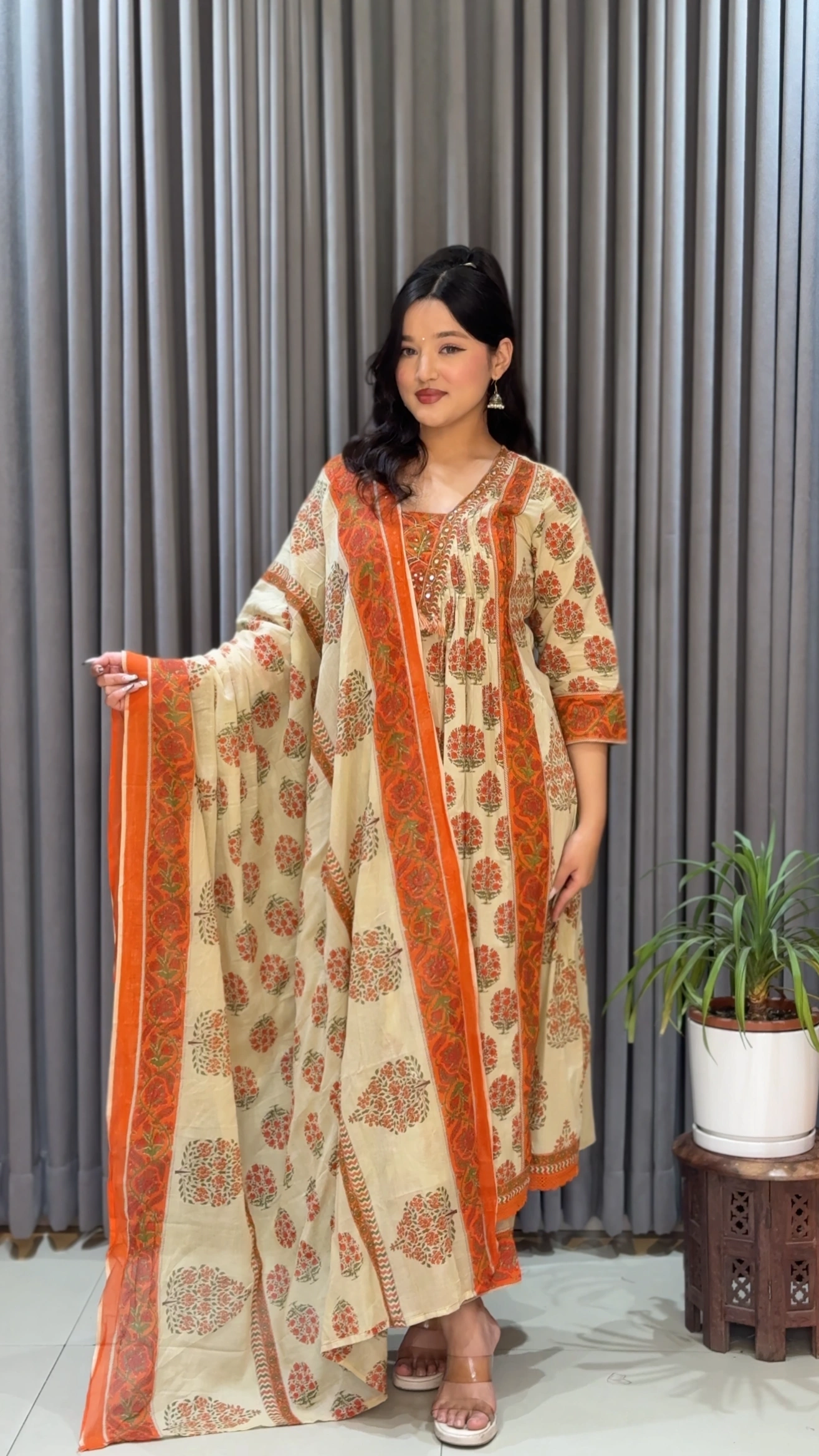 Elevate your everyday elegance with SHREEVASTRALAYA’s Orange Beige Floral A-Line Kurthi Set. Designed with intricate traditional floral motifs in rich maroon tones, this outfit beautifully blends heritage with modern comfort. The flattering A-line silhouette ensures a graceful flow, while the detailed neckline adds a refined touch of sophistication.
