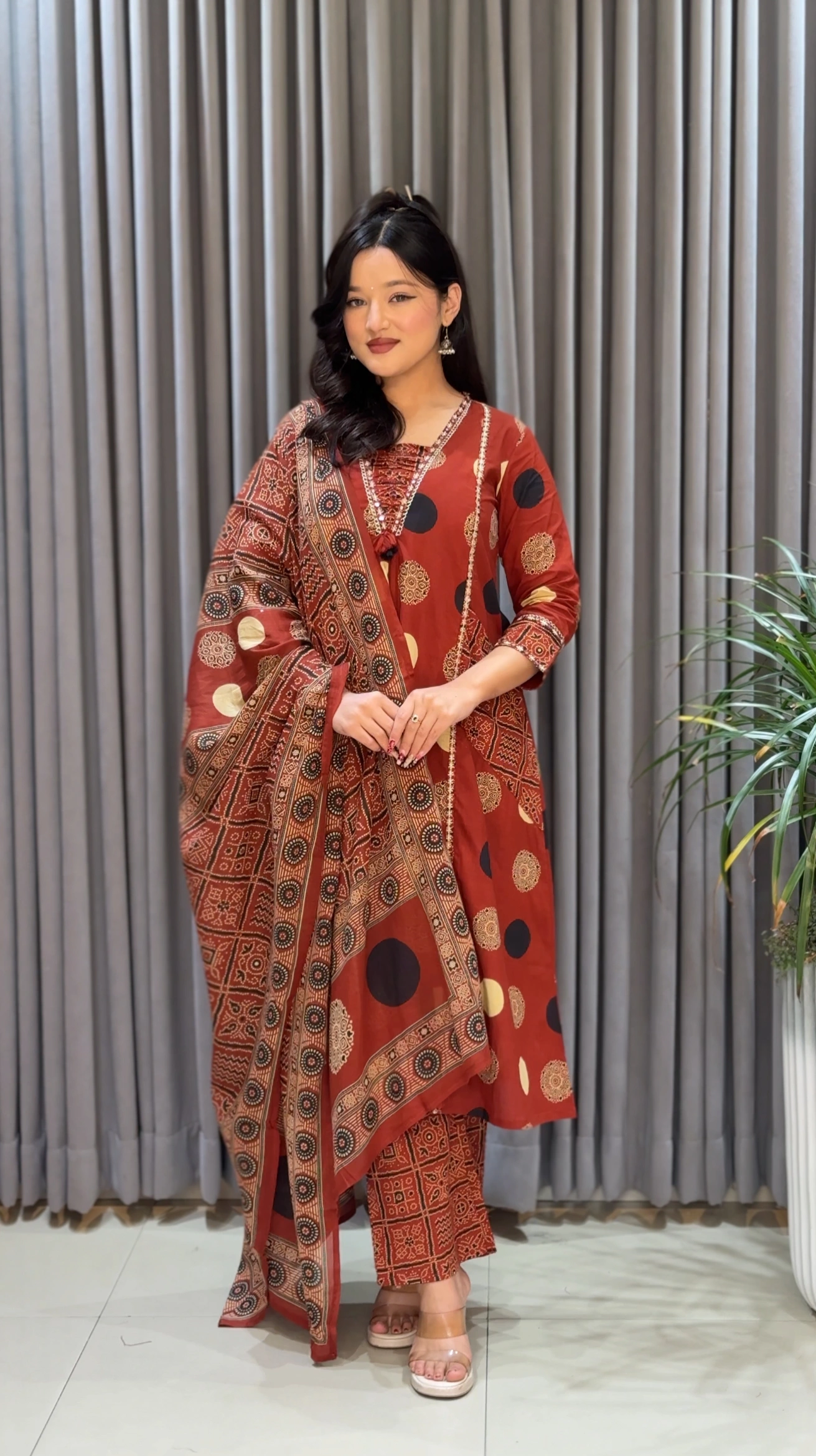 The kurthi is beautifully detailed with traditional-inspired circular prints and subtle golden accents that add richness to the overall look. Paired with a coordinated printed dupatta featuring an intricately designed border and matching straight-fit pants, this set creates a complete and polished ensemble.