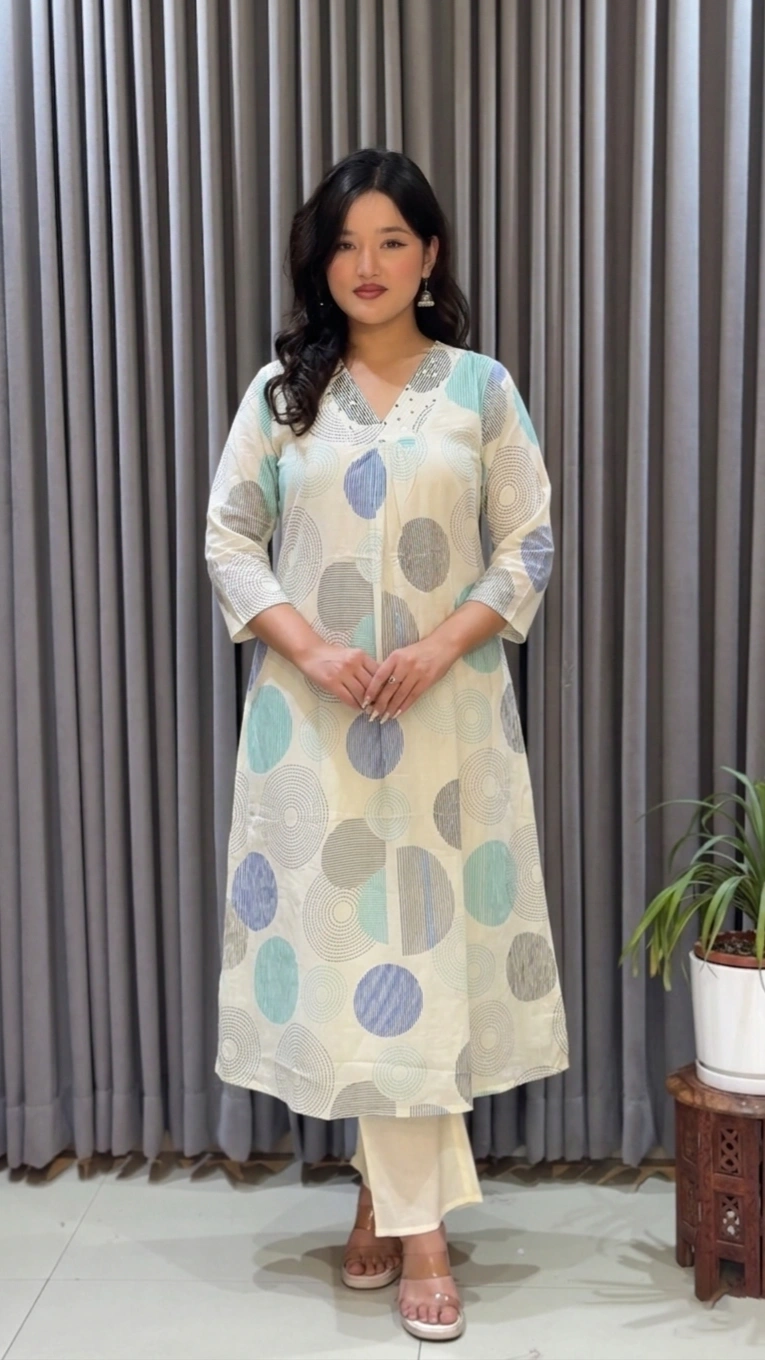 Elevate your everyday elegance with the A Pure Cotton Co-ords Set by Shreevastralaya – proudly Made in Nepal. Designed with soft pastel tones and artistic circular prints, this kurthi set brings a perfect blend of comfort and modern ethnic charm.