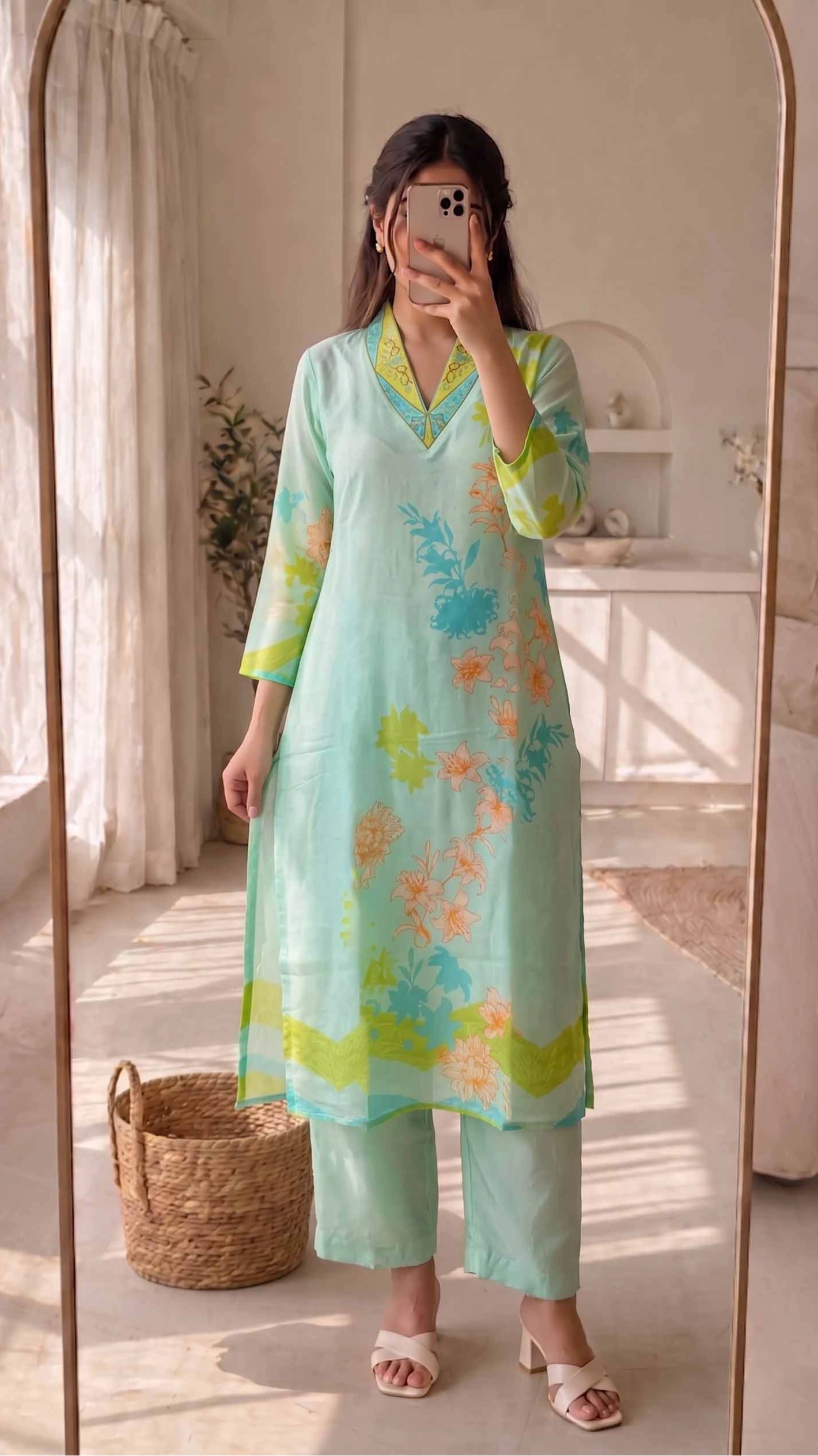 Step into effortless elegance with this aqua silk kurthi with pant set from Shreevastralaya. Adorned with soft floral prints in soothing pastel tones, this kurthi brings a refreshing charm to your wardrobe. The beautifully designed V-neckline and 3/4th sleeves enhance its graceful appeal, while the straight-fit pants provide all-day comfort. Perfect for casual outings, small gatherings, or festive daywear, this ensemble blends tradition with modern simplicity.