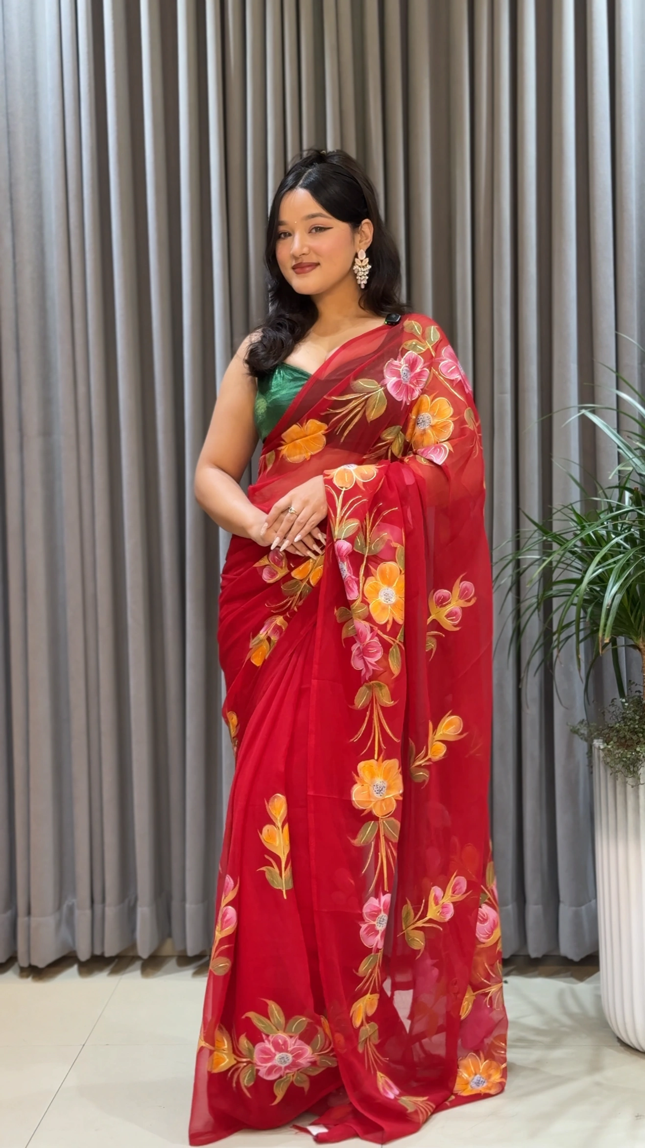 The red base is enhanced with delicate hand-painted floral motifs in soft hues of peach, yellow, and blush, adding a fresh and feminine touch. The sheer texture of chiffon lends an airy feel, making it perfect for festive gatherings, parties, and special occasions.