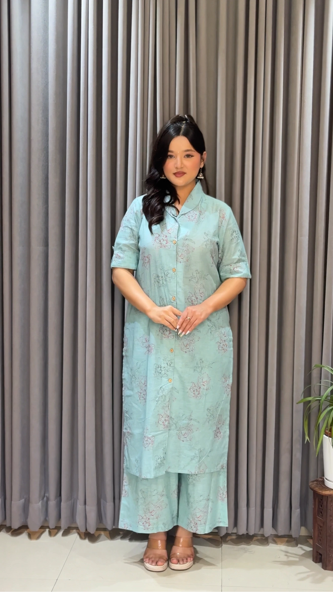 Elevate your everyday elegance with this beautifully crafted Blue floral kurthi set from Shreevastralaya. Designed with a soft, soothing color palette and delicate floral prints, this outfit blends simplicity with timeless grace. The straight-cut kurthi features a button-down front and relaxed sleeves, offering both comfort and style. Paired with matching bottoms, this set is perfect for casual outings, office wear, or intimate gatherings. Made in Nepal with attention to detail, it reflects understated sophistication and effortless charm.