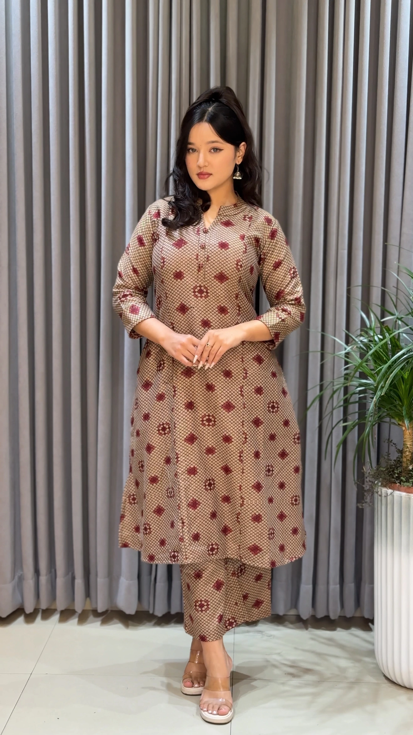 The kurta features a graceful A-line silhouette that flares lightly from the waist, creating a flattering shape that complements all body types. A muted taupe-beige base is beautifully accented with maroon geometric and floral-inspired motifs, giving the outfit a contemporary yet traditional charm. The matching straight pants carry the same design continuity, ensuring a coordinated and polished look.