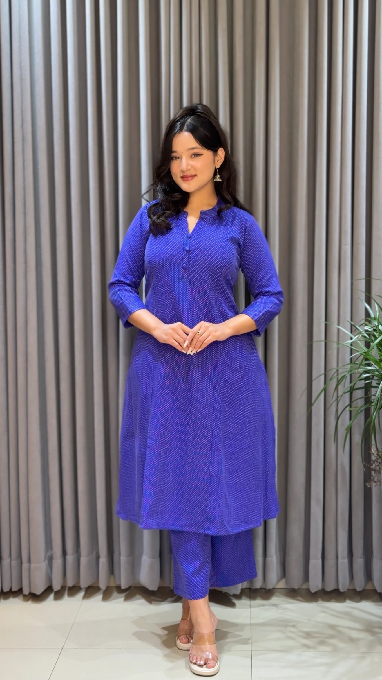 The kurta features an elegant A-line cut that flares gently from the waist, creating a flattering, feminine silhouette that skims over the hips and flows to the mid-calf. It is paired with matching plazo pants—wide-legged and softly tapered at the ankle—for a chic, relaxed fit that balances structure and ease. The entire set is rendered in a sophisticated blue base, subtly woven with iridescent flecks of blue, rose, and gold, giving it a quiet shimmer that catches the light with every step.