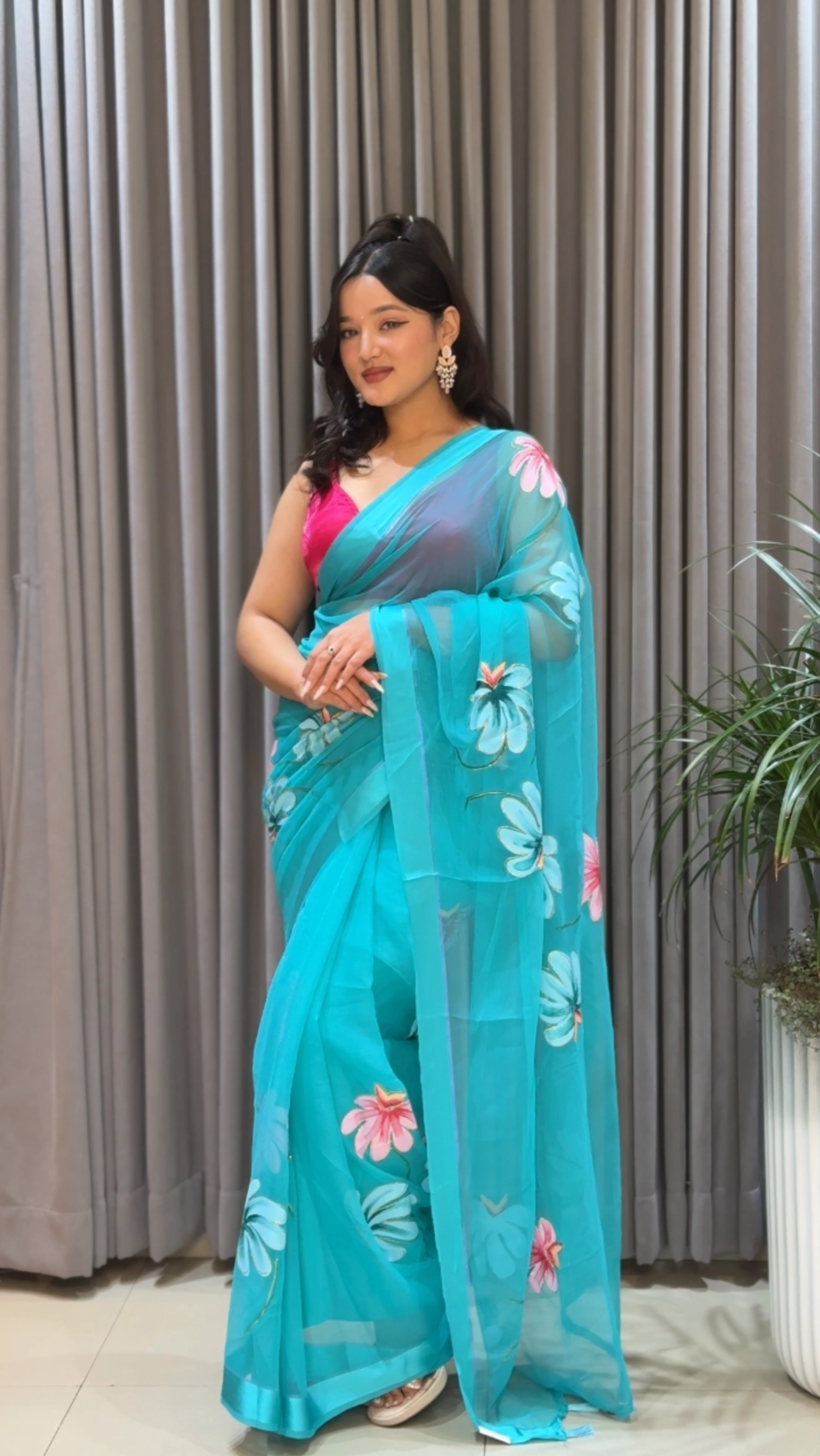 The saree features a refreshing aqua-blue base adorned with oversized white and pink floral motifs that add a lively, youthful vibrance. The soft pastel blooms create a fresh, breezy visual appeal, while the smooth chiffon fabric enhances movement with every step. Its coordinated design results in a graceful, flattering silhouette that radiates subtle sophistication.