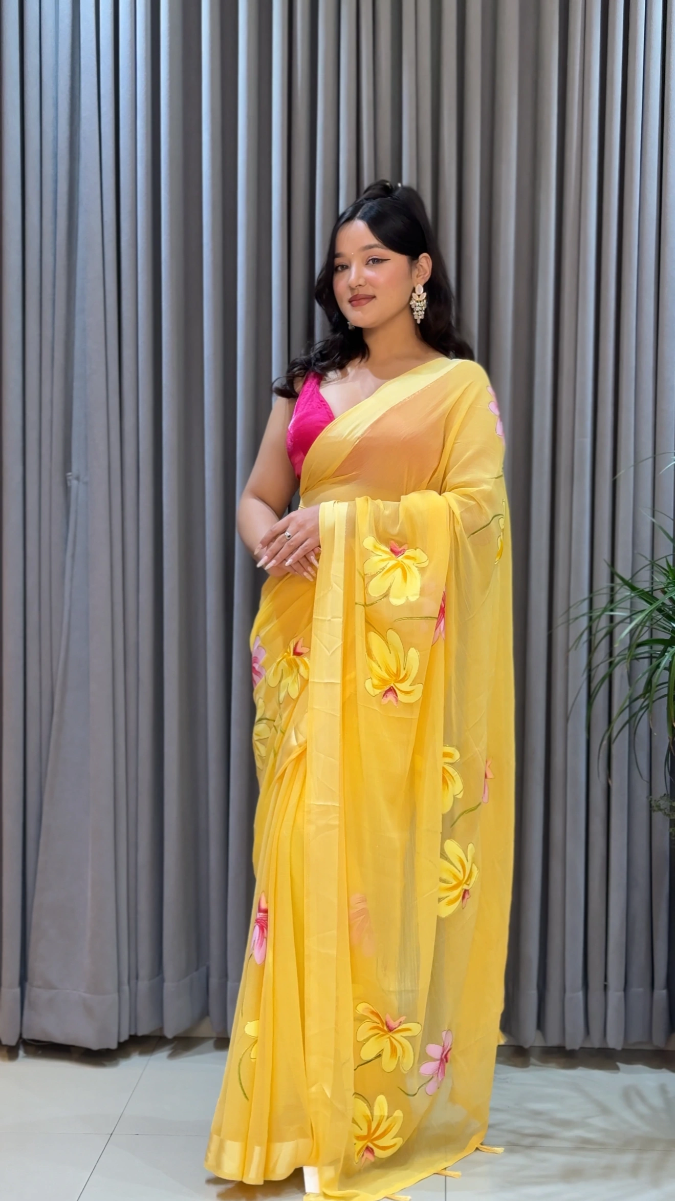 With its breezy comfort, vibrant floral detailing, and versatile drape, this chiffon saree is an ideal choice for brunches, celebrations, office events, or elegant casual wear.