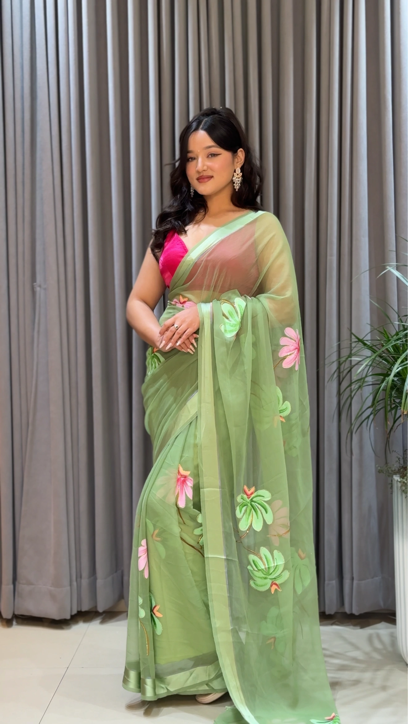 The saree features a refreshing aqua-green base adorned with oversized green and pink floral motifs that add a lively, youthful vibrance. The soft pastel blooms create a fresh, breezy visual appeal, while the smooth chiffon fabric enhances movement with every step. Its coordinated design results in a graceful, flattering silhouette that radiates subtle sophistication.