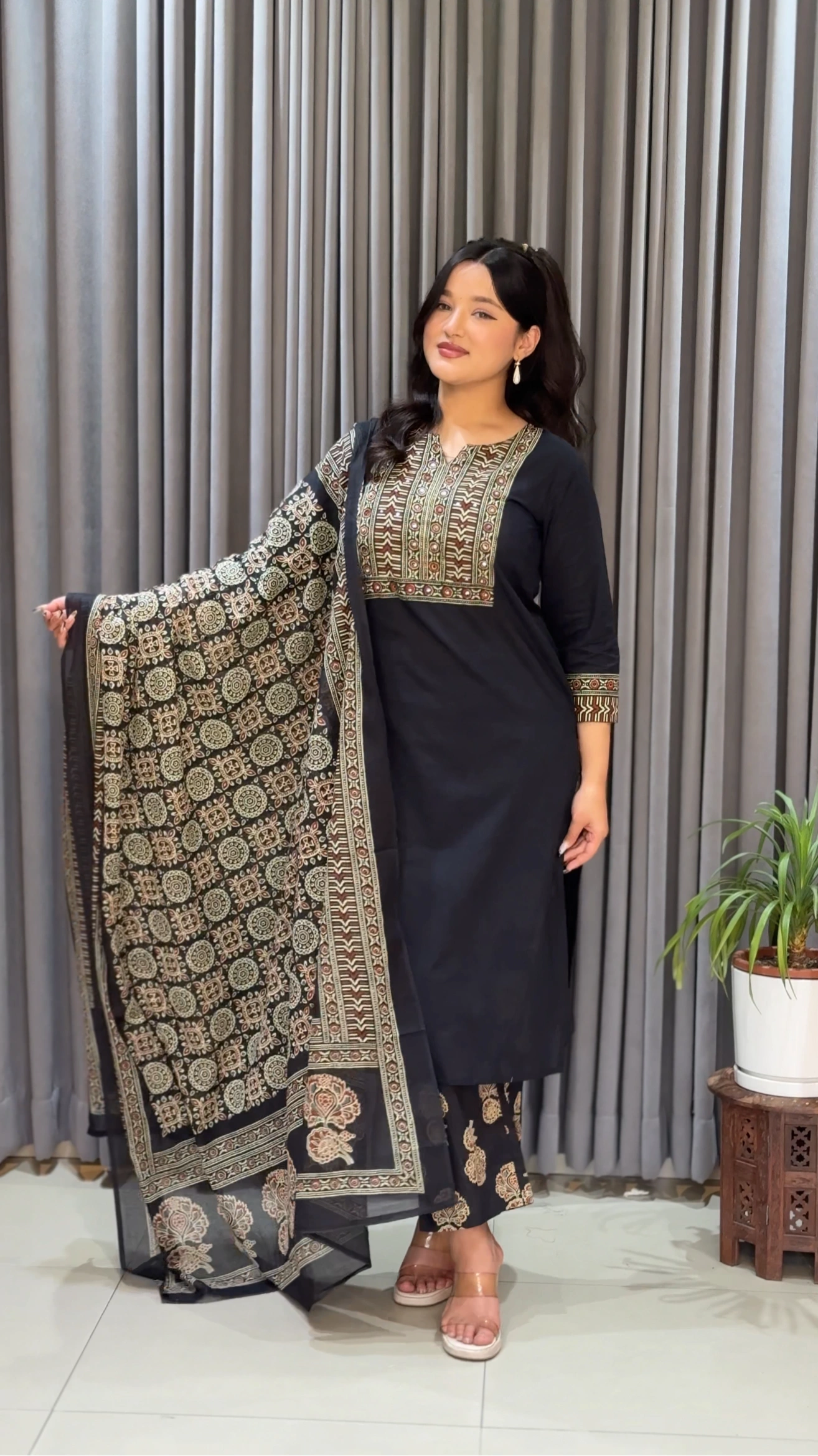 Paired with a matching printed pant and a statement dupatta featuring detailed traditional motifs, this outfit is perfect for festive gatherings, cultural events, or elegant everyday wear. The deep black tone combined with artistic prints creates a bold yet graceful style statement.