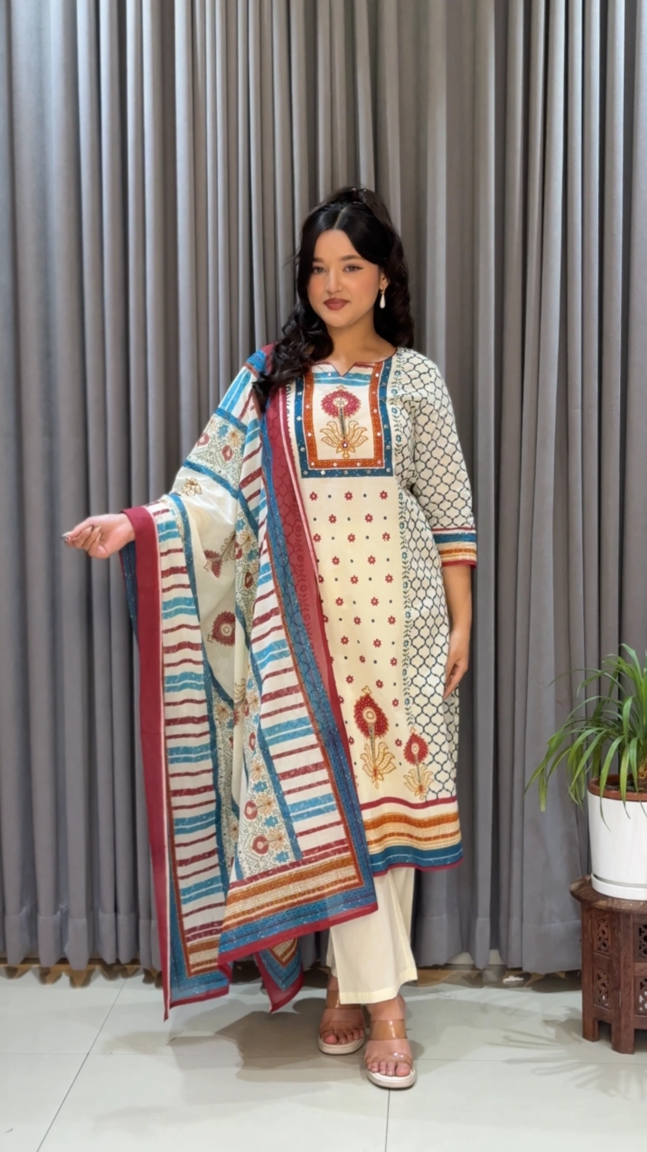 Step into effortless elegance with this beautifully crafted Block Print Cotton Set from Shreevastralaya, proudly made in Nepal. Designed for the modern woman who loves a blend of tradition and comfort, this ensemble features intricate ethnic prints in soothing ivory, accented with rich tones of maroon and teal.