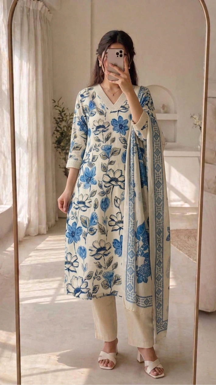 Step into effortless elegance with this Blue Floral Printed Kurthi Set from SHREEVASTRALAYA. Designed with a refreshing floral print, this kurthi features a flattering straight silhouette with a stylish V-neckline and contrast detailing on the neckline and sleeves. Paired with comfortable solid pants and a matching lightweight dupatta, this set is perfect for everyday wear, office looks, or casual outings. The soft, breathable fabric ensures all-day comfort while keeping your style graceful and modern.