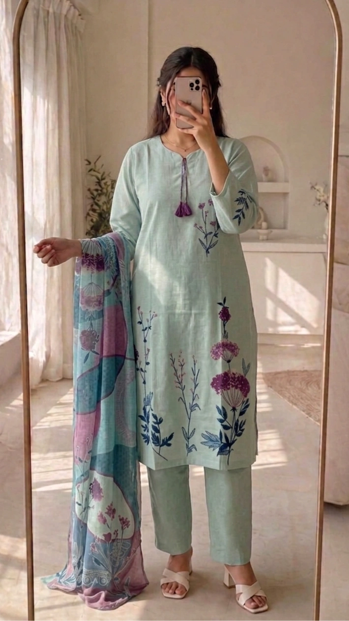 Step into effortless elegance with this Light Blue Floral Printed Kurthi Set from SHREEVASTRALAYA. Designed with a refreshing floral print, this kurthi features a flattering straight silhouette with a stylish U-neckline with slit and contrast detailing on the neckline and sleeves. Paired with comfortable solid pants and a matching lightweight dupatta, this set is perfect for everyday wear, office looks, or casual outings. The soft, breathable fabric ensures all-day comfort while keeping your style graceful and modern.