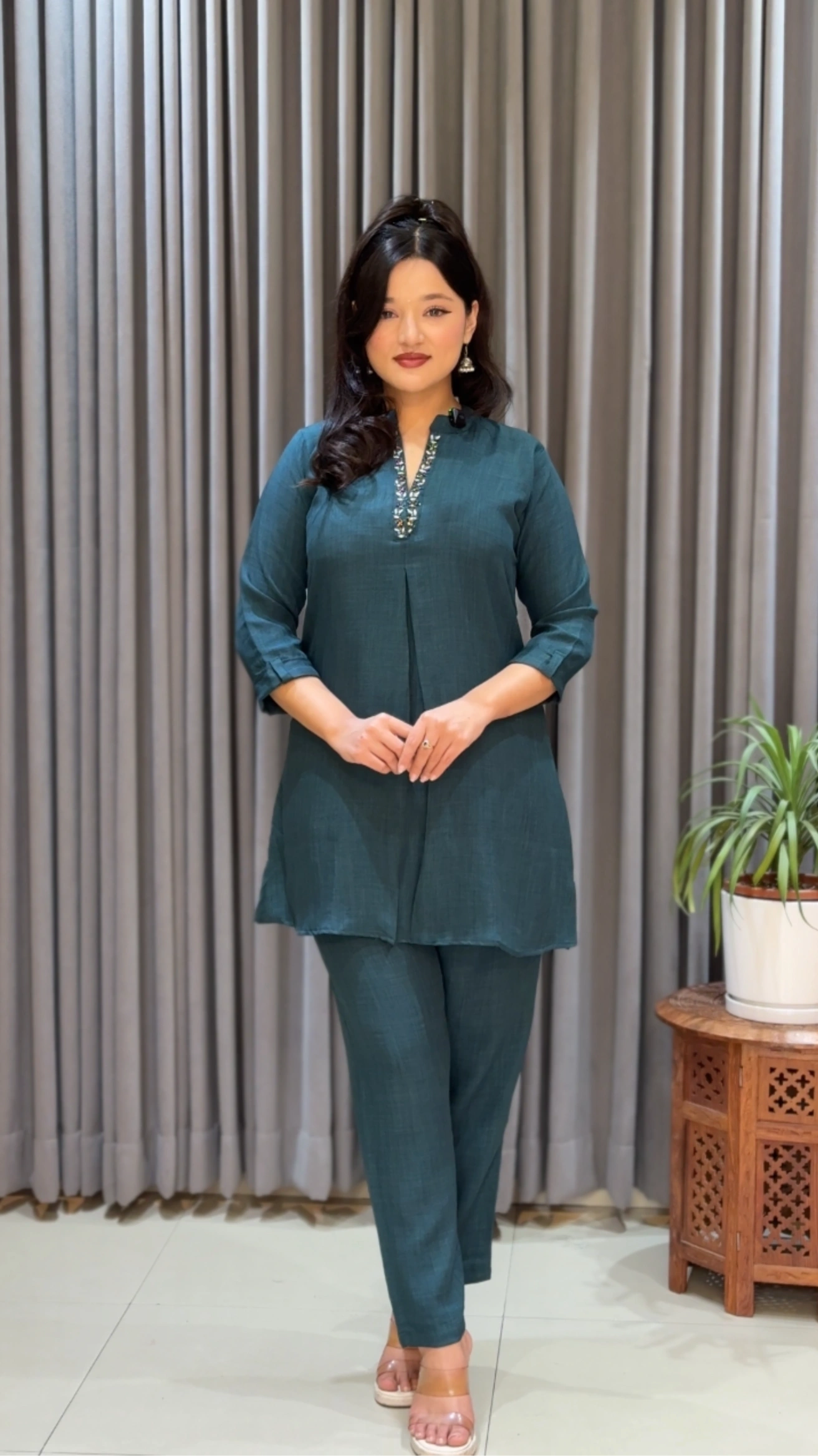 The kurthi features a clean straight silhouette with a length of 34 inches, highlighted by a beautifully detailed neckline that adds a subtle touch of elegance. Paired with matching straight pants with a length of 38 inches, this co-ords set creates a balanced and modern look suitable for both casual and semi-formal occasions.