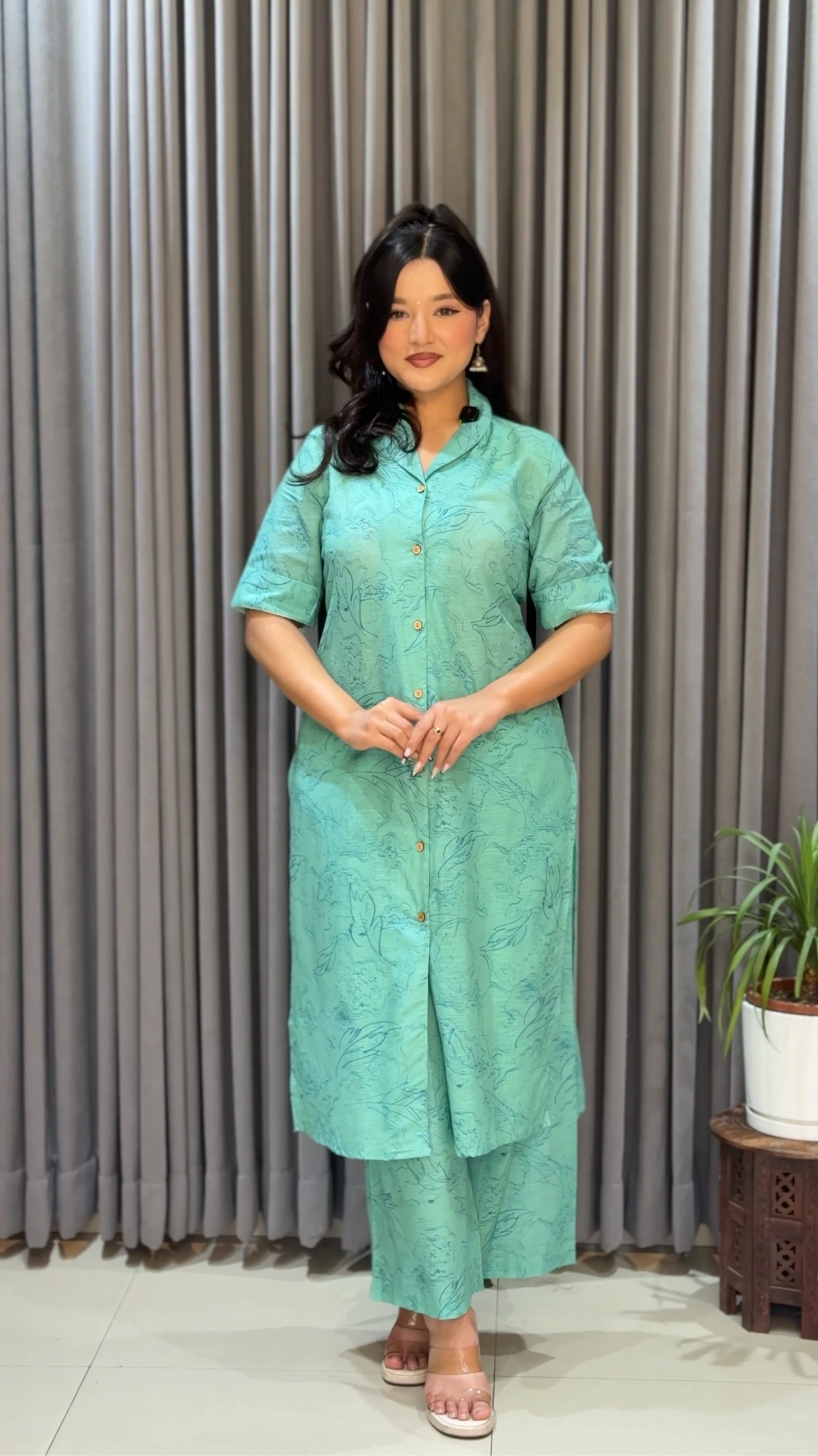 The straight-cut kurthi features a stylish mandarin collar with front button detailing, paired with relaxed-fit pants for all-day comfort. Perfect for casual wear, office looks, or light festive occasions, this outfit blends simplicity with timeless charm.