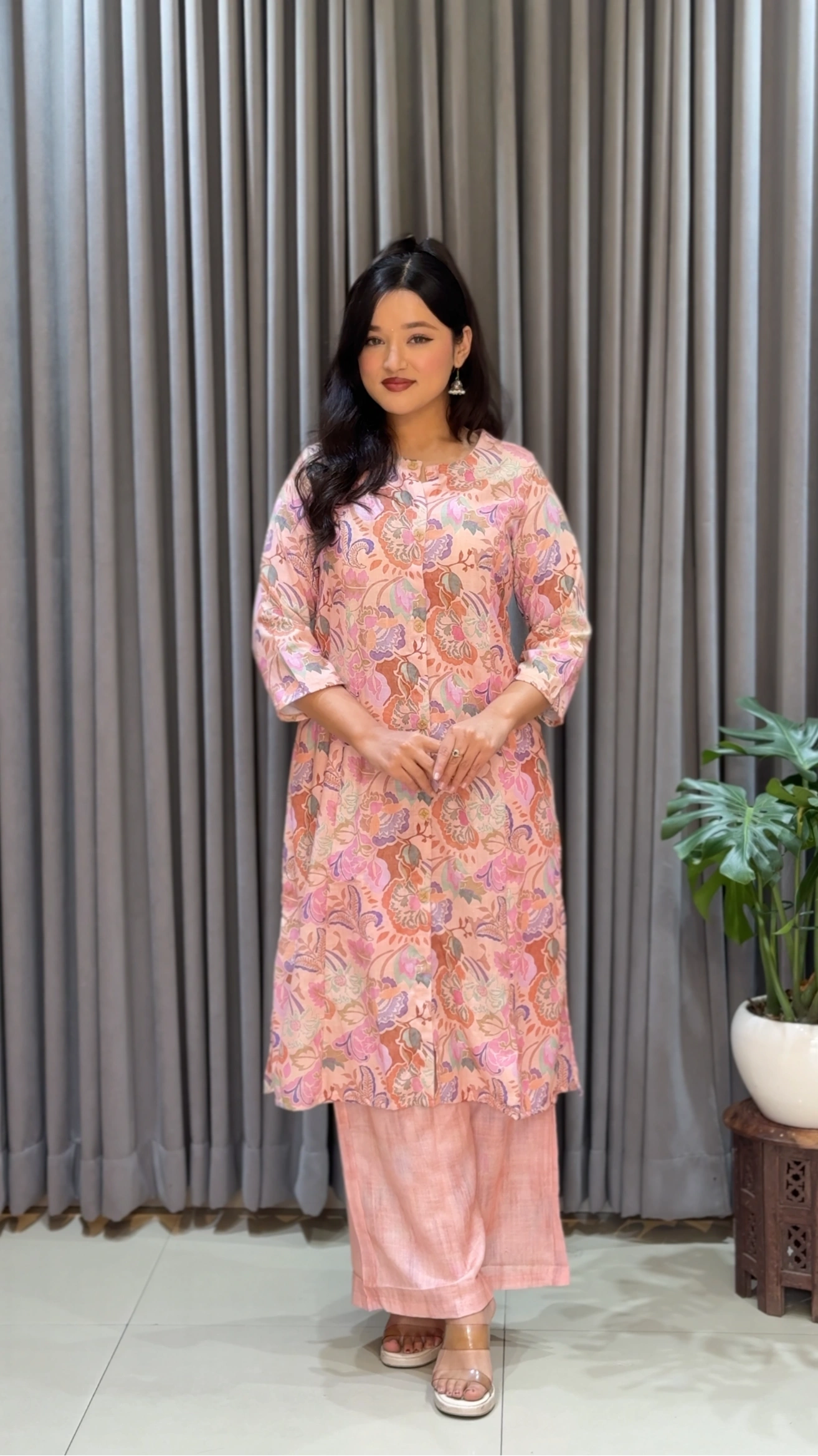 The kurta showcases delicate floral prints in soft blush tones, creating a fresh and feminine appeal. Paired with matching straight-fit cotton bottoms, this ensemble blends tradition with modern simplicity — perfect for brunches, festive gatherings, office wear, or casual outings.