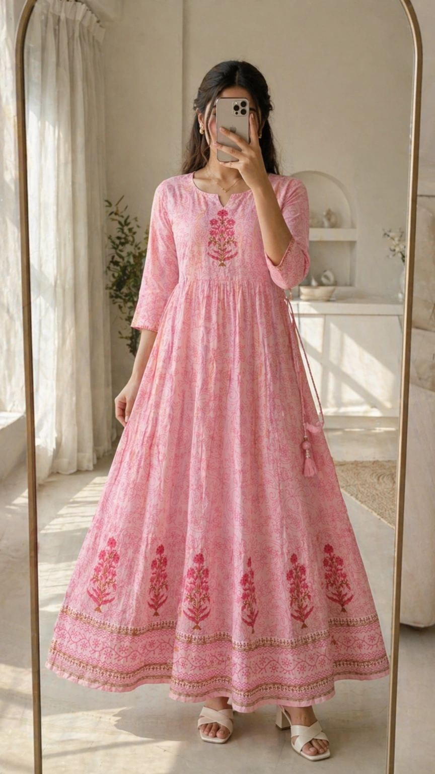 Embrace effortless grace with the Blush Bloom Anarkali Kurthi by Shreevastralaya. Designed in a soft pink hue, this elegant piece features delicate floral prints complemented by intricate embroidery on the neckline. The flowy Anarkali silhouette creates a flattering, feminine look, while the detailed border at the hem adds a touch of traditional charm. Perfect for festive gatherings, casual celebrations, or daytime events, this kurthi blends comfort with timeless style.