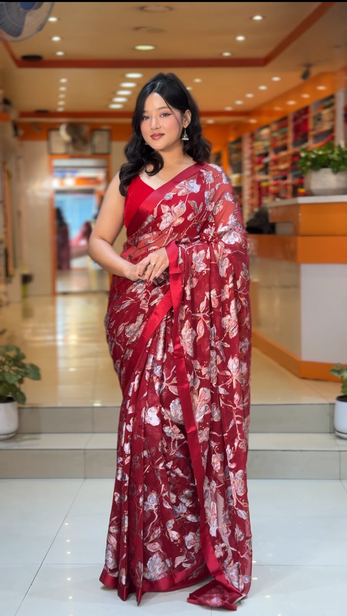 This image beautifully captures a woman radiating elegance and poise in a mesmerizing white brasso work saree. Adorned with intricate floral patterns and a subtle sheen, the saree embodies timeless grace with a modern touch. Crafted from fine brasso fabric, it offers a soft, lightweight drape and refined sophistication — perfect for festive gatherings and elegant occasions.