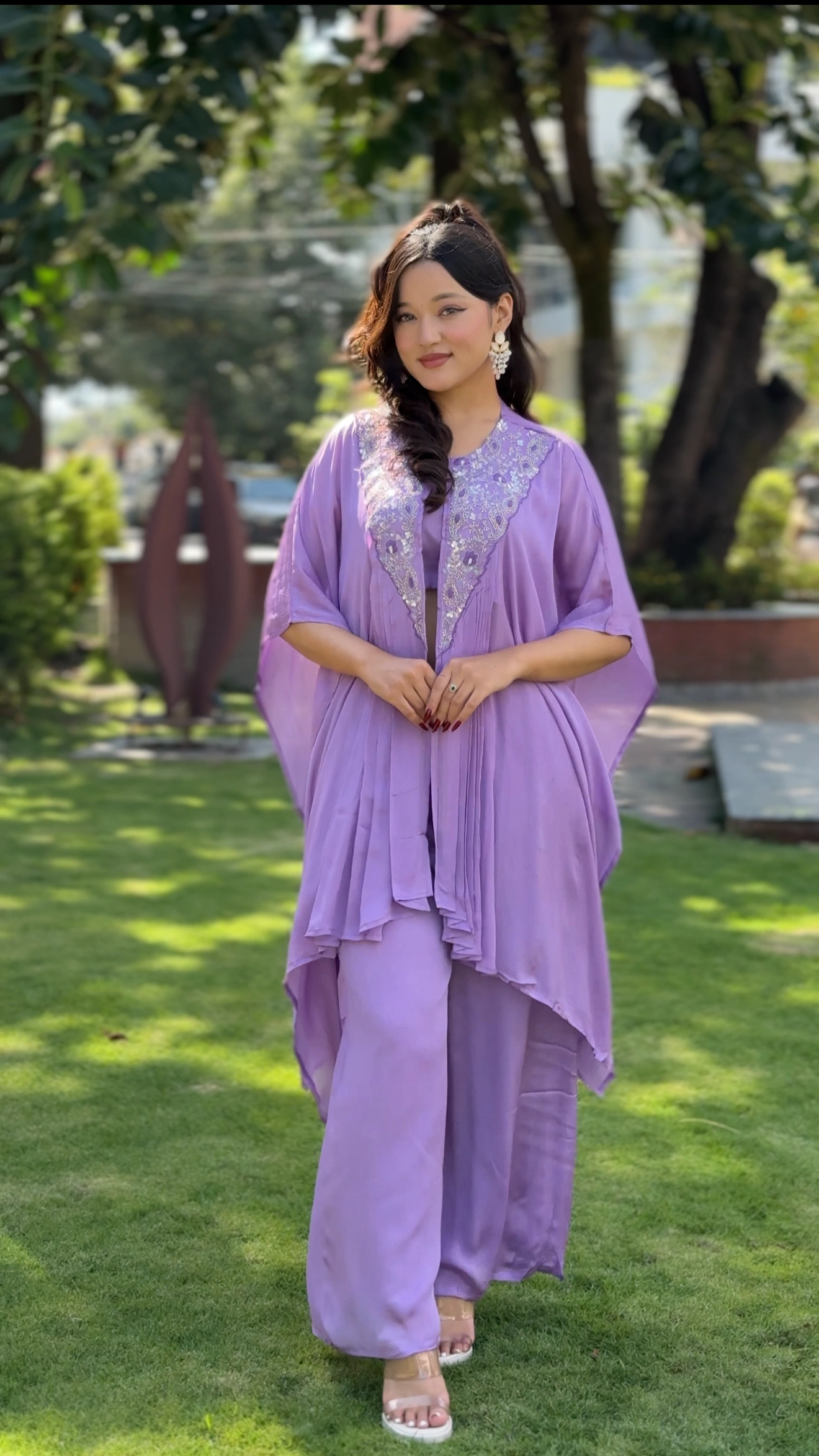 Step into elegance with the Lavender Grace – Chinon Silk Handwork Set. Crafted from soft, flowing chinon silk, this ensemble features: