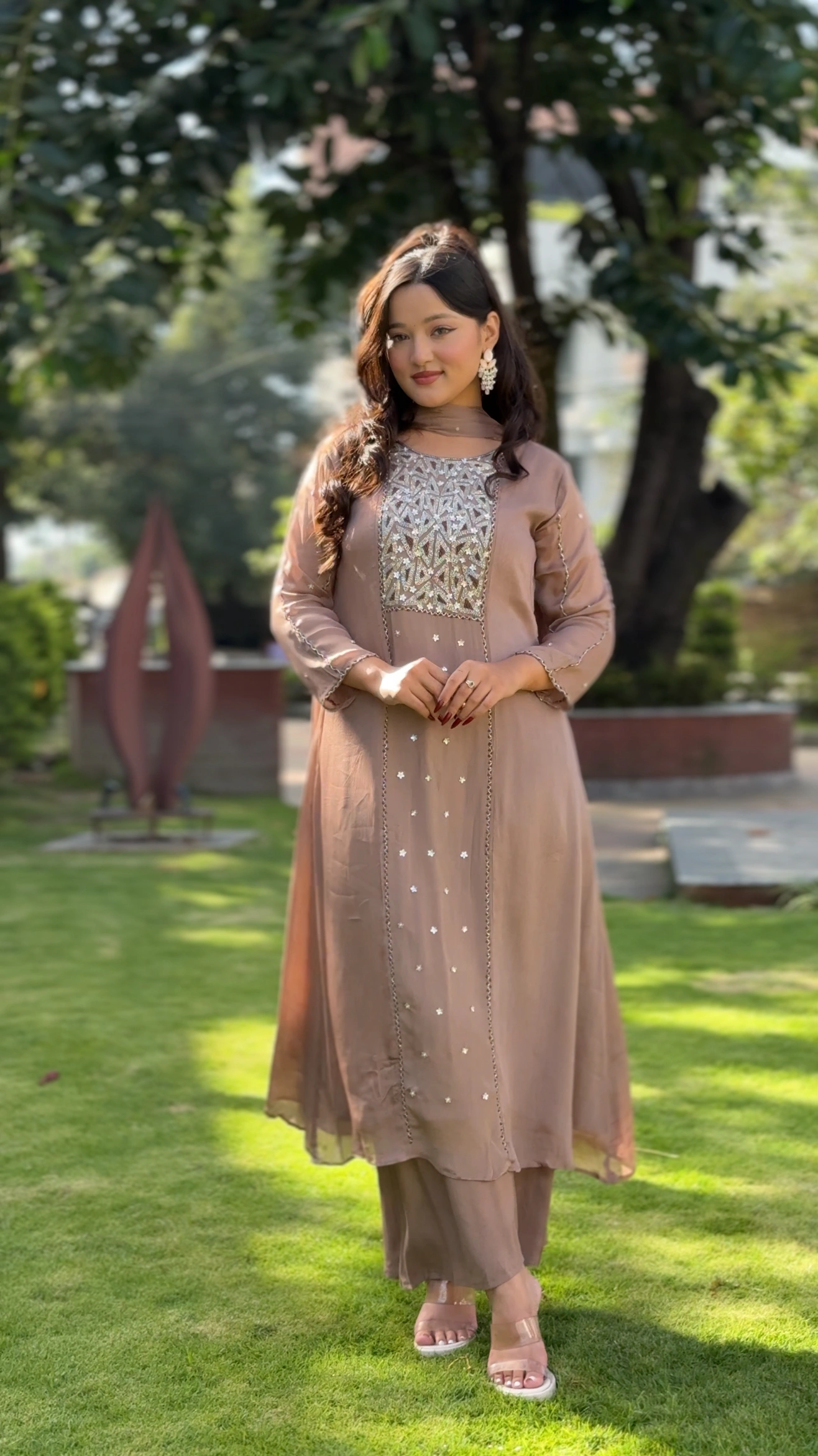 Step into timeless elegance with the Mocha Luxe – Chinon Silk Handwork Set. Crafted from soft, flowing Chinon silk, this ensemble blends modern charm with traditional craftsmanship, featuring:
