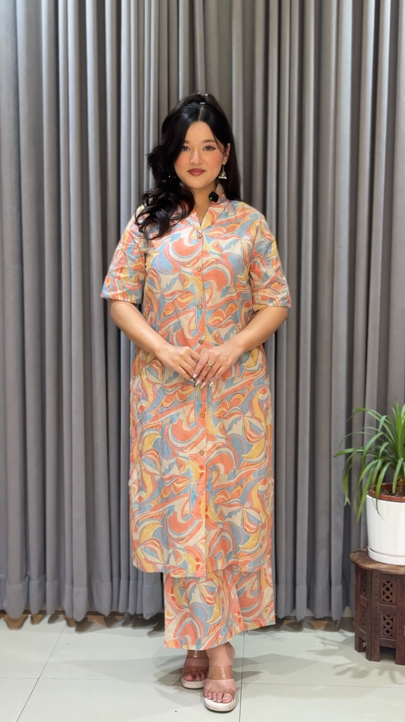 Elevate your everyday elegance with this beautifully designed Peach Co-Ord Kurthi Set. Featuring a soft swirl pattern in shades of pink, peach, and muted grey, this outfit blends contemporary style with traditional charm. The straight-cut kurthi with front buttons pairs effortlessly with matching straight pants, creating a coordinated look that is both chic and comfortable. Perfect for casual outings, brunch dates, or relaxed festive gatherings, this set is designed to keep you stylish all day long.