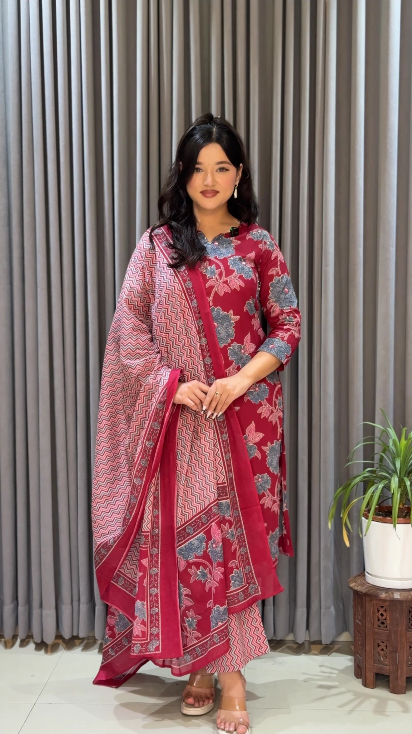 Elevate your everyday elegance with this beautifully crafted crimson kurthi set from Shreevastralaya, a proudly Nepal-based brand. Designed with delicate floral prints in soft grey tones, this outfit perfectly blends tradition with modern grace. The kurthi features a flattering straight silhouette, paired with a coordinated printed bottom and a lightweight dupatta showcasing intricate zigzag patterns and border detailing.