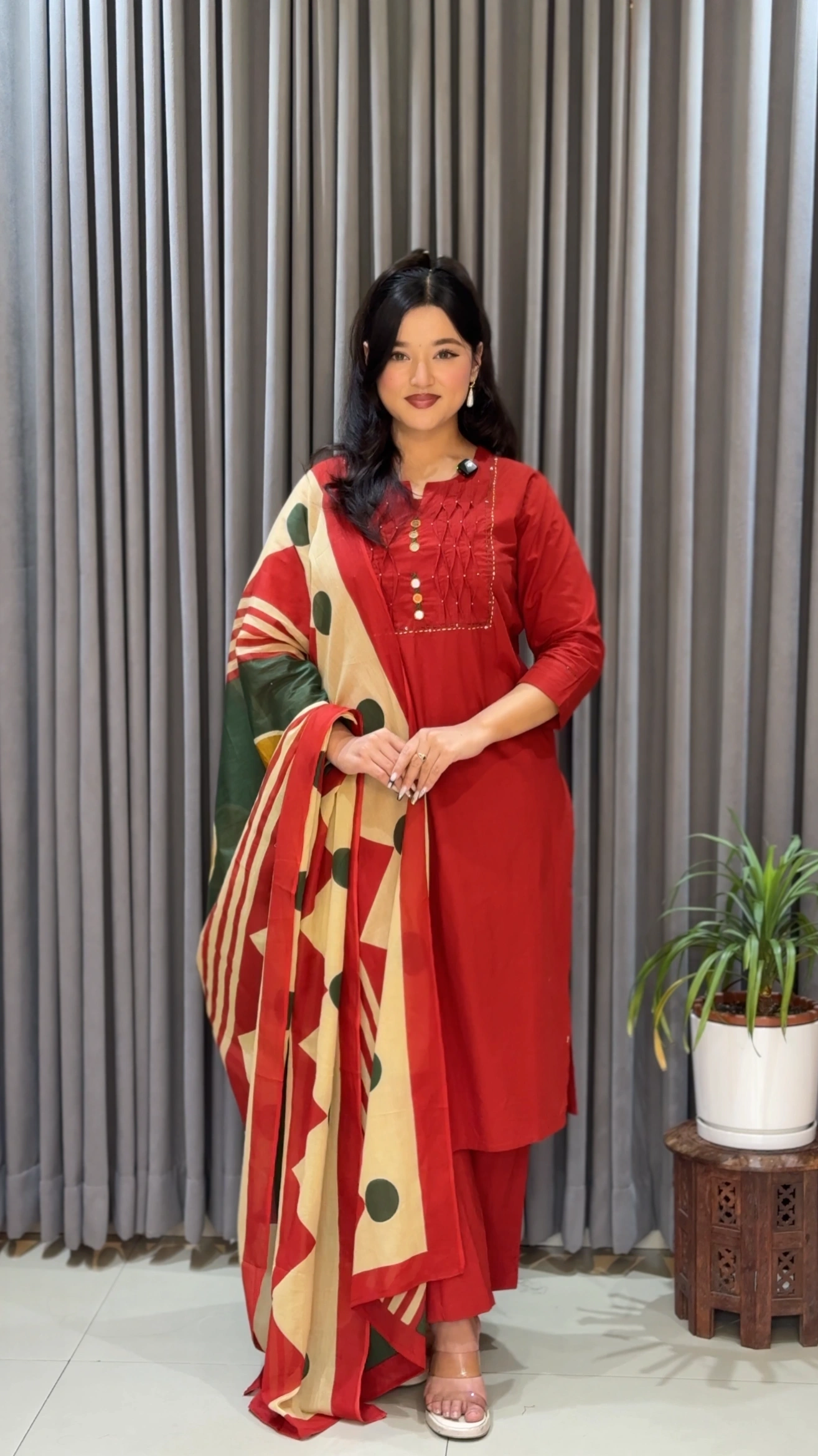 Make a bold and graceful statement with this stunning Red Dabu Cotton Kurthi Set from Shreevastralaya. Crafted with love in Nepal, this elegant outfit features a rich red kurthi adorned with subtle front detailing, paired with matching bottoms and a beautifully printed ethnic dupatta.