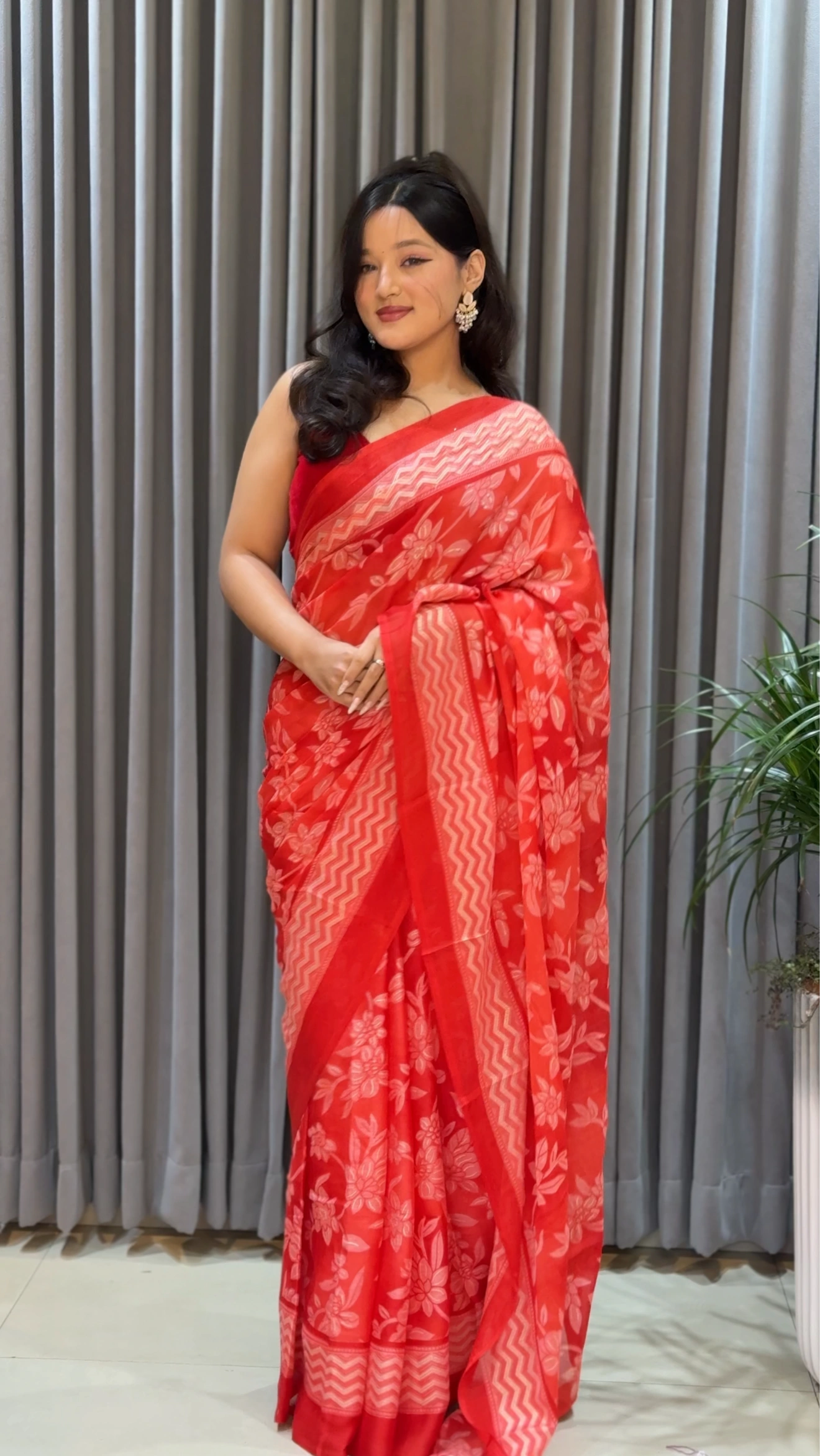 The saree features a rich red base adorned with delicate floral motifs in softer tones, creating a refreshing yet bold visual harmony. Its flowing patterns and feminine detailing add depth, movement, and effortless charm to the overall silhouette. The subtly patterned border adds definition, making the drape look refined and beautifully structured.