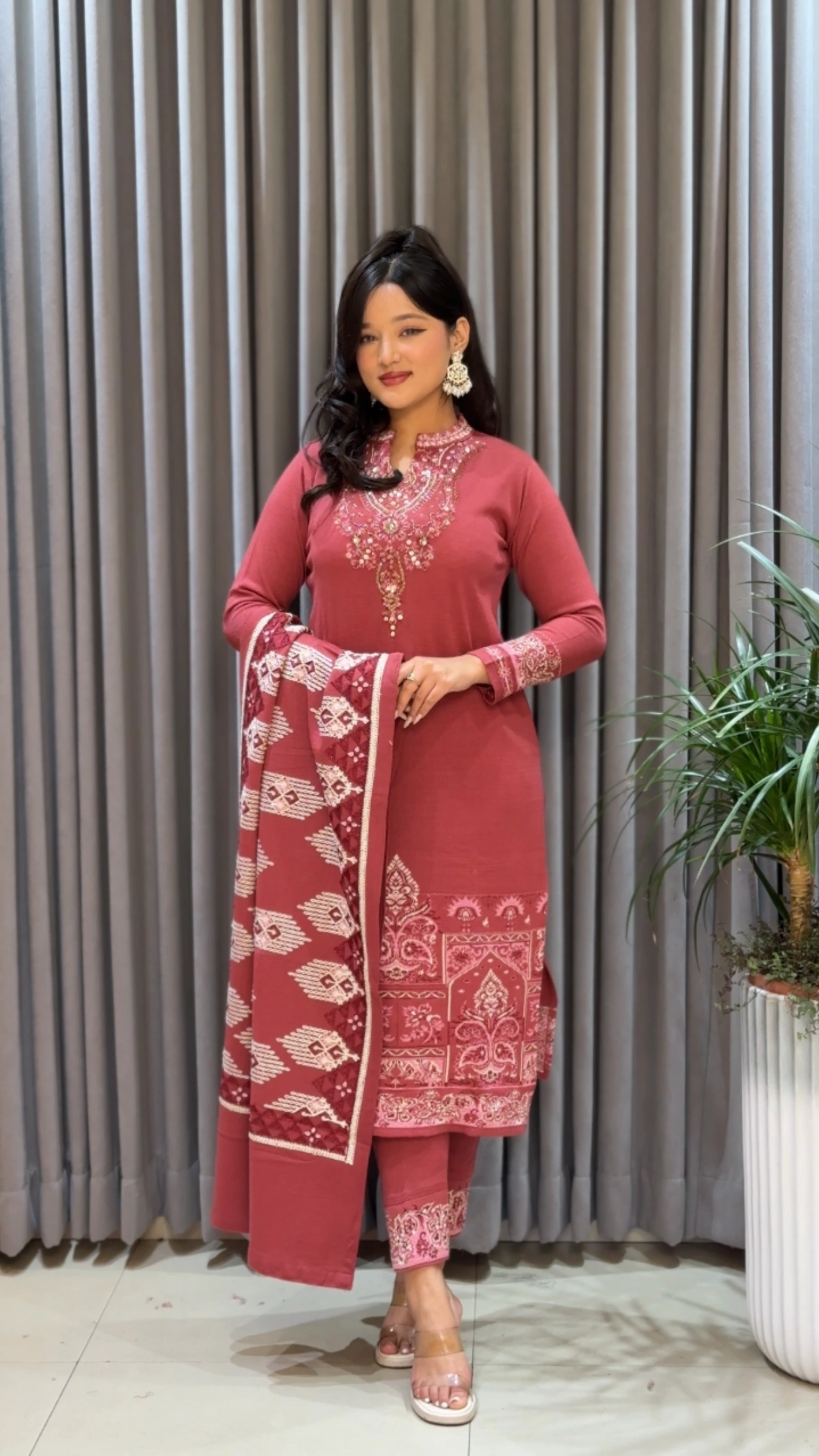 With its gentle color palette, winter-perfect woolen texture, and finely crafted embroidery, this suit is an ideal choice for women seeking comfort, elegance, and traditional beauty in one masterpiece.