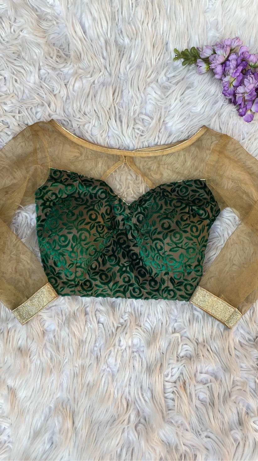 Emerald Green Velvet Blouse featuring elegant patterned fabric with net sleeves and neckline highlighted in golden detailing. A perfect blend of luxury and grace, ideal for festive and wedding wear.