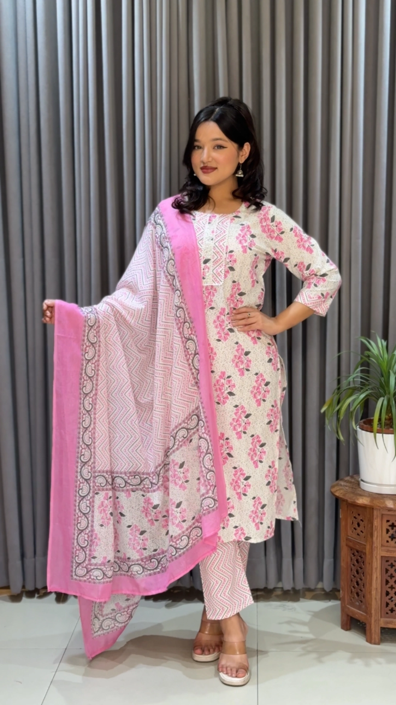 Add effortless elegance to your ethnic wardrobe with the Pink Blossom Kurthi Set from Shreevastralaya, a proudly Nepal-based fashion brand known for stylish and comfortable designs. This beautiful outfit features a graceful off-white kurthi adorned with delicate blue floral prints that create a fresh and sophisticated look.