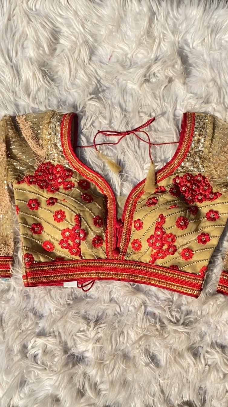 A refined golden blouse featuring elegant red floral embroidery, designed to complement traditional attire with a luxurious finish. The detailed embroidery adds depth and sophistication, while the rich golden base enhances its festive appeal. Ideal for weddings, celebrations, and formal ethnic occasions, this blouse pairs effortlessly with sarees and lehengas for a polished, graceful look.