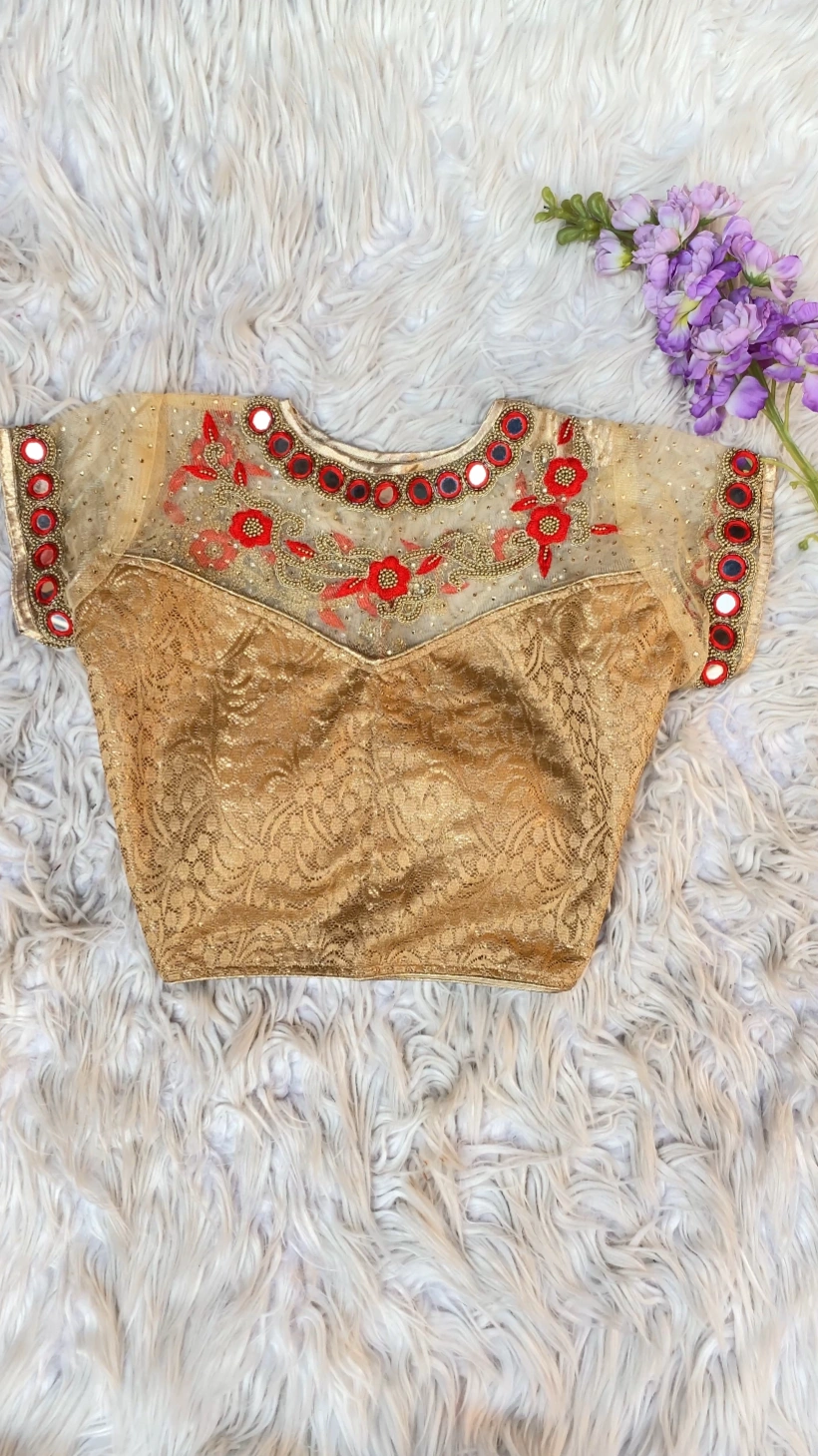 Exude timeless elegance with our Golden Heirloom Floral Mirror Work Blouse, crafted to celebrate traditional artistry with a refined finish. The blouse features a rich gold lace fabric base that adds texture and subtle shimmer, making it a perfect choice for festive and ceremonial wear.