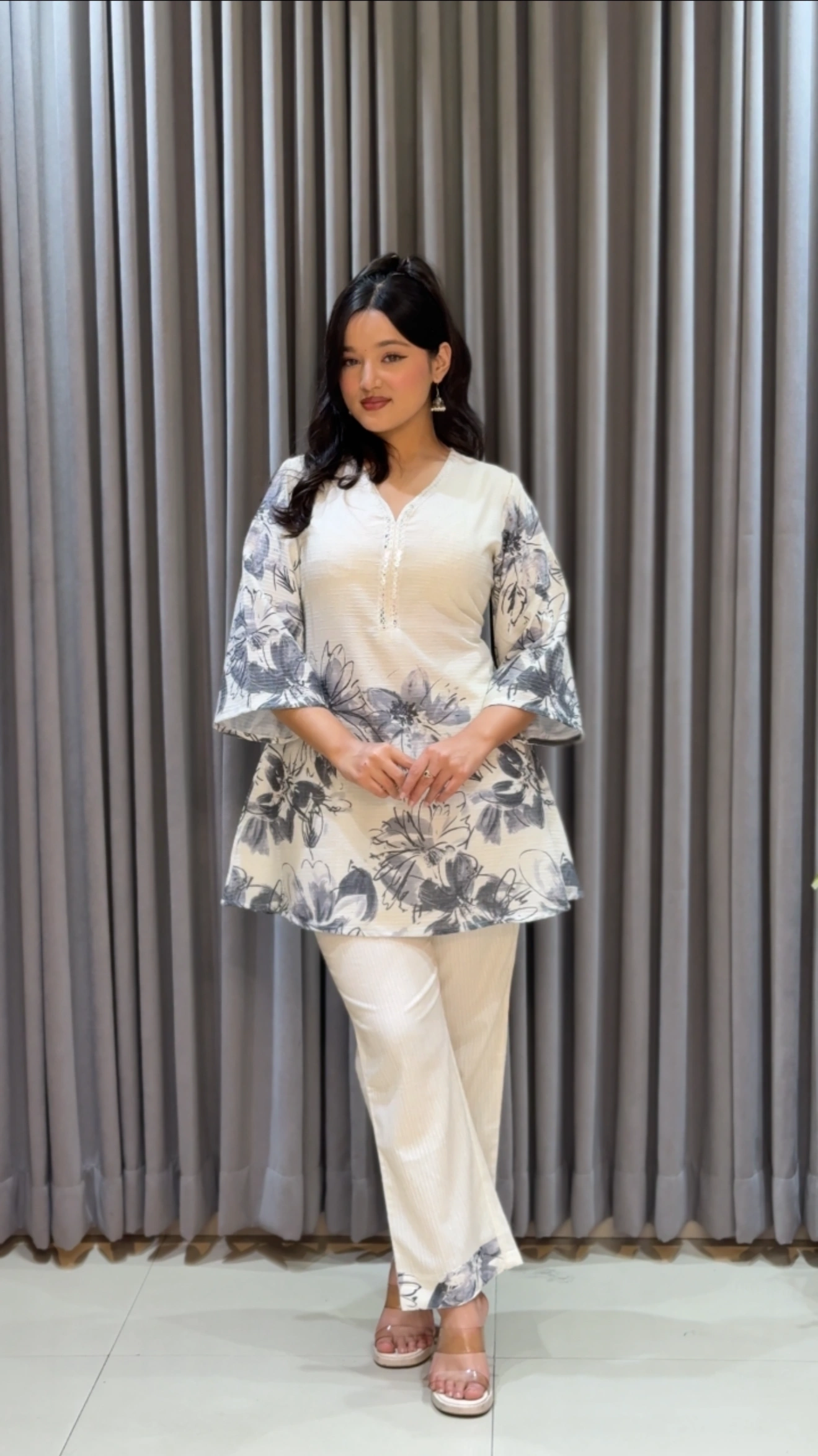 The kurthi features a graceful V-neckline with subtle button detailing, adding a refined touch to the overall design. The beautiful floral bloom prints create a modern feminine look, while the stylish flared three-quarter sleeves enhance the graceful silhouette. With a 35-inch kurthi length, the kurthi gives a trendy and flattering appearance.