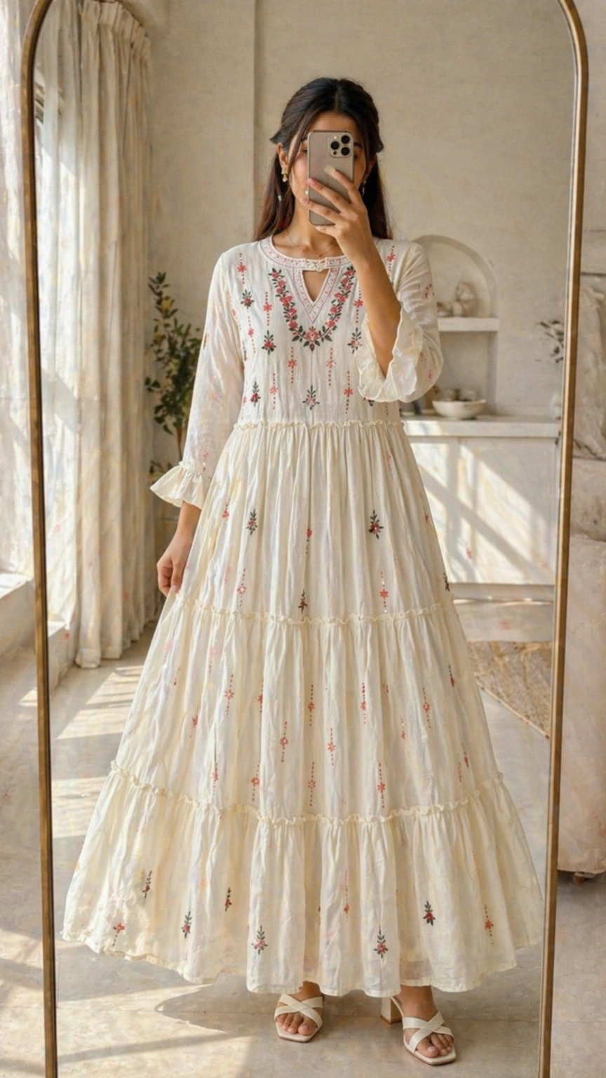 The kurta features delicate floral embroidery across the yoke and subtle motifs throughout, paired with a beautifully tiered silhouette that adds soft volume and elegance. Its breathable fabric ensures all-day comfort, while the flattering flow makes it perfect for both relaxed and festive settings.
