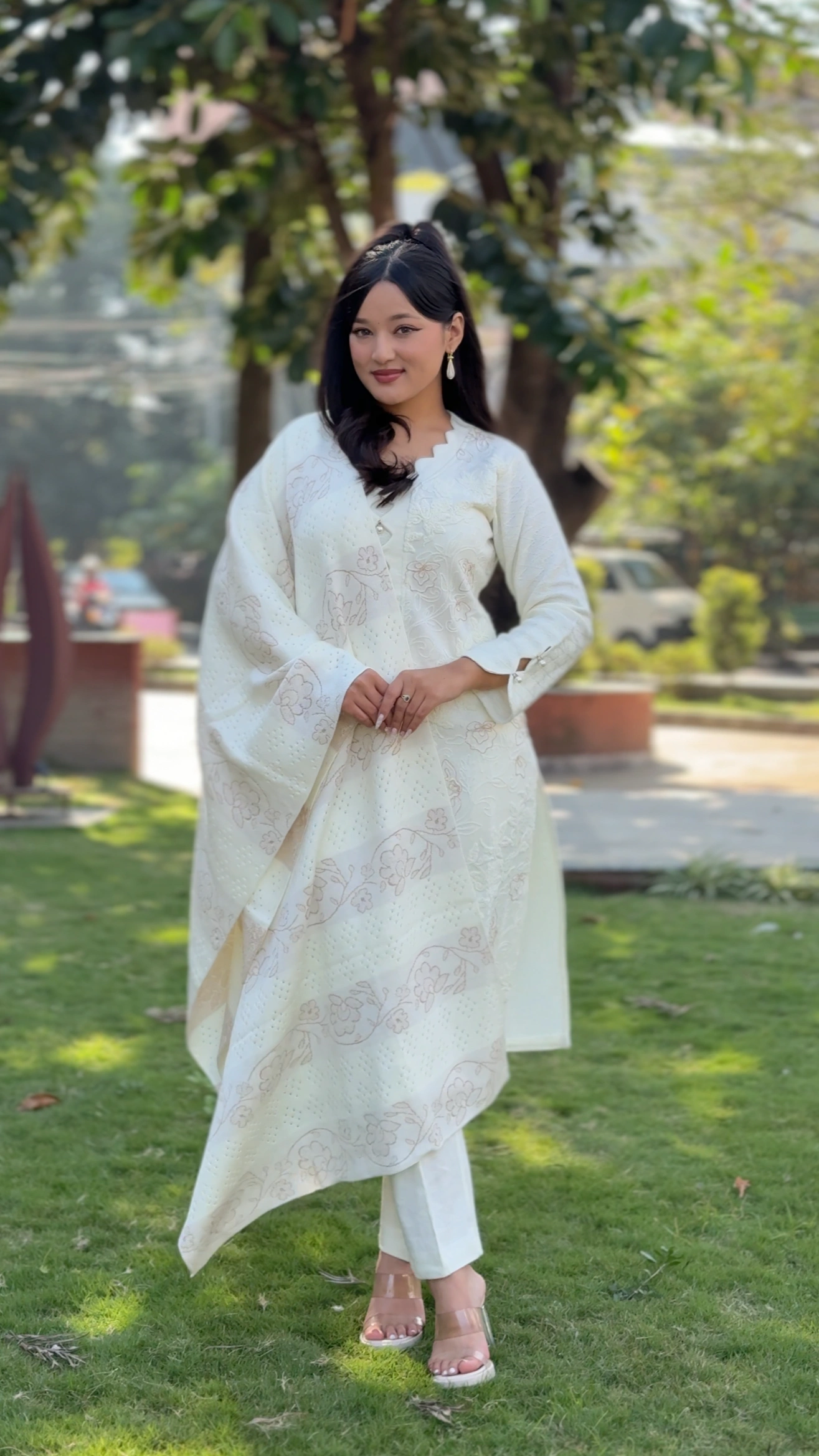 The pure ivory hue symbolizes calmness and simplicity, while the intricate embroidery brings a gentle artistry to the overall look, making it both timeless and effortlessly stylish.