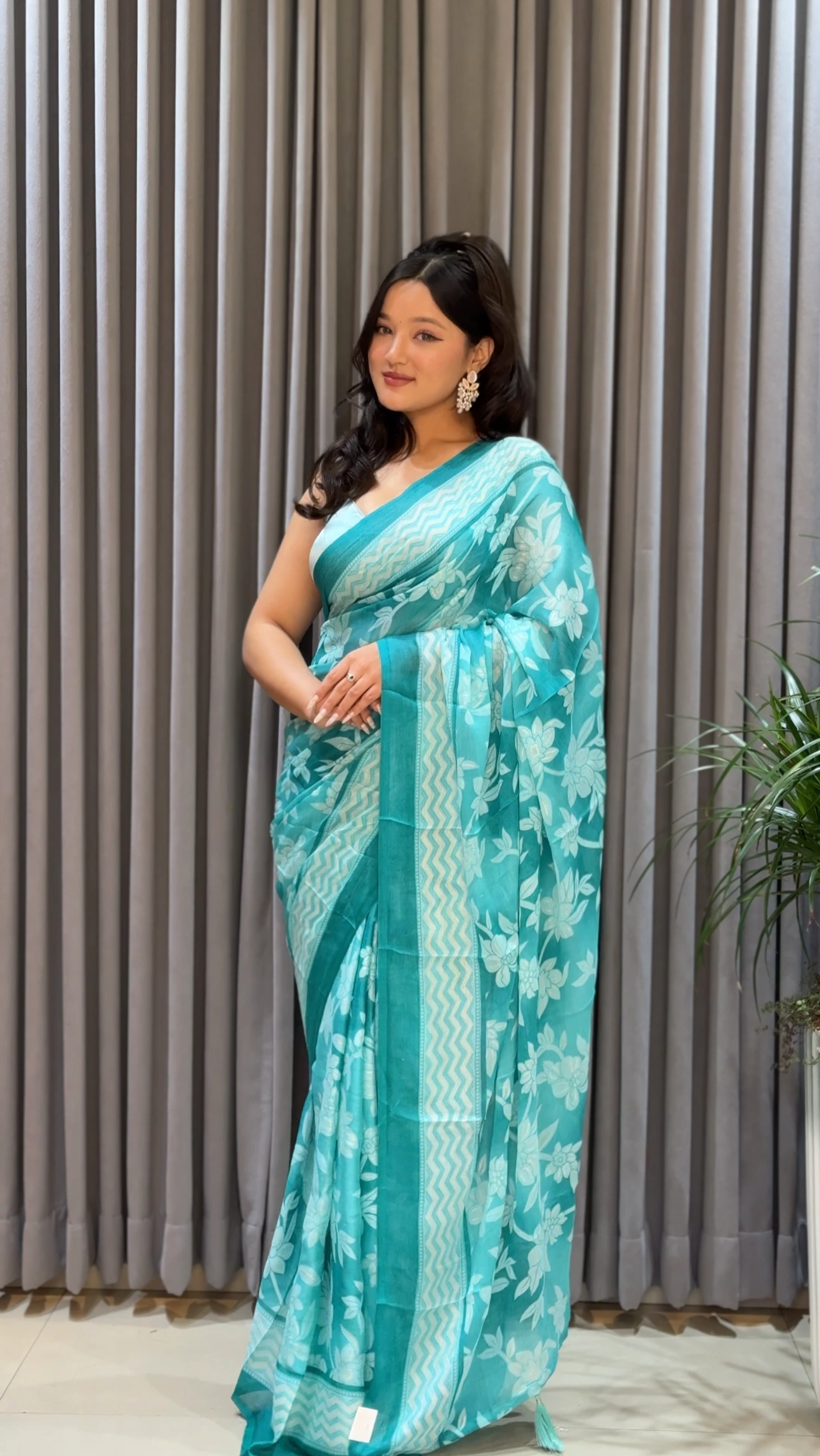 With its airy texture, lively color palette, and timeless floral motifs, this saree is an ideal choice for women who appreciate ease, beauty, and modern elegance wrapped into one lightweight drape.
