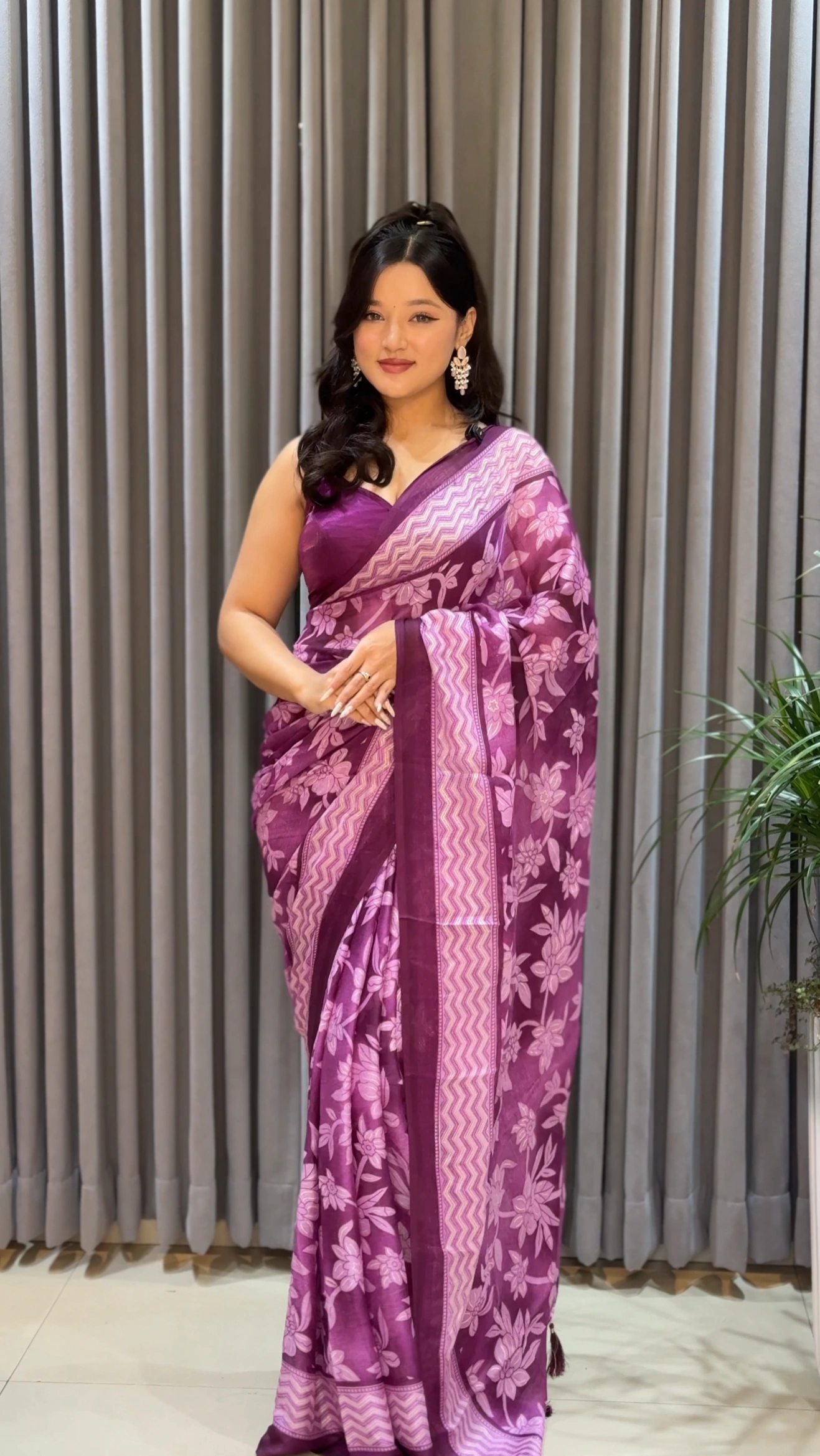 The saree features the same refined floral design as the original piece, now presented on a vibrant Purple base that adds warmth, brightness, and cheerful sophistication. The floral patterns blend beautifully with the vivid backdrop, creating a harmonious balance between bold color and delicate artistry. Its subtly detailed border enhances the saree’s structure, giving it a polished and stylish finish without overpowering its graceful appeal.