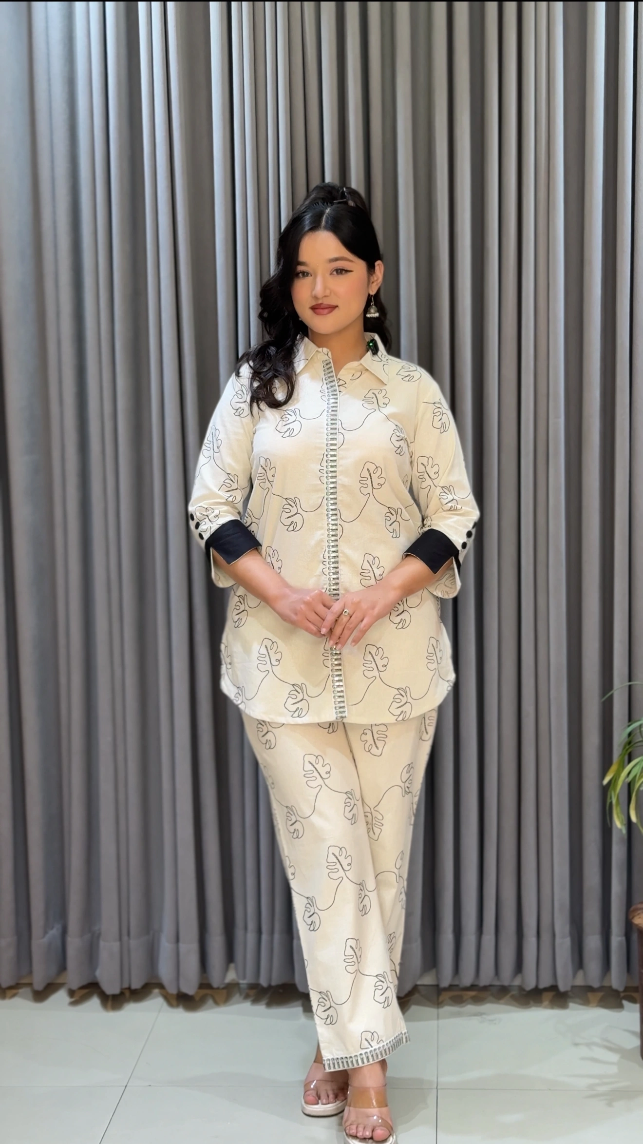 Effortlessly chic and modern, the SHREEVASTRALAYA Ivory Breeze Co-Ord Set is designed for comfort with a touch of elegance. Featuring a soft ivory base adorned with subtle abstract leaf prints, this outfit brings a fresh and minimal aesthetic to your wardrobe. The button-down shirt with statement detailing and relaxed-fit pants create a polished yet easygoing look—perfect for casual outings, brunch dates, or relaxed workwear. The contrast cuff accents add a hint of sophistication, making this set both versatile and stylish.