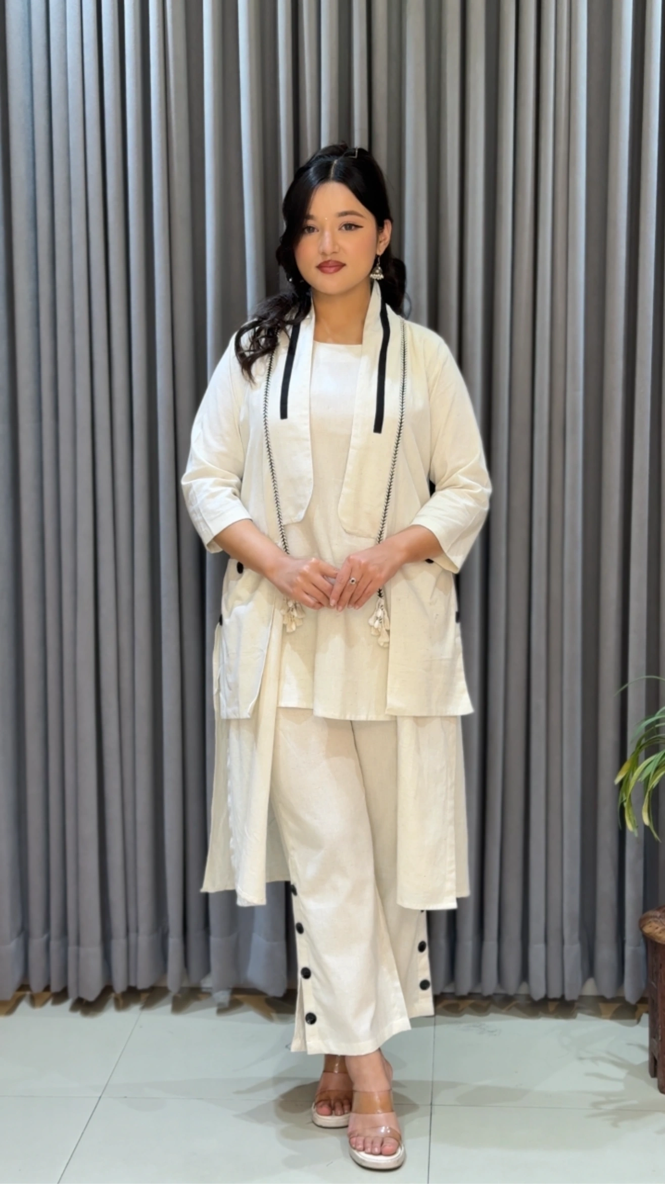 Effortlessly chic and modern, the SHREEVASTRALAYA Ivory Breeze Co-Ord Set is designed for comfort with a touch of elegance. Featuring a soft ivory base adorned with subtle abstract leaf prints, this outfit brings a fresh and minimal aesthetic to your wardrobe. The button-down shirt with statement detailing and relaxed-fit pants create a polished yet easygoing look—perfect for casual outings, brunch dates, or relaxed workwear. The contrast cuff accents add a hint of sophistication, making this set both versatile and stylish.