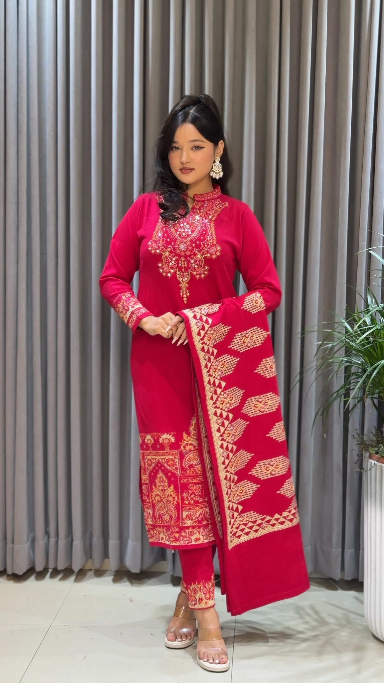 With its luxurious winter texture, striking color palette, and artisan embroidery, this woolen suit is perfect for women who appreciate classic elegance paired with warmth and comfort.
