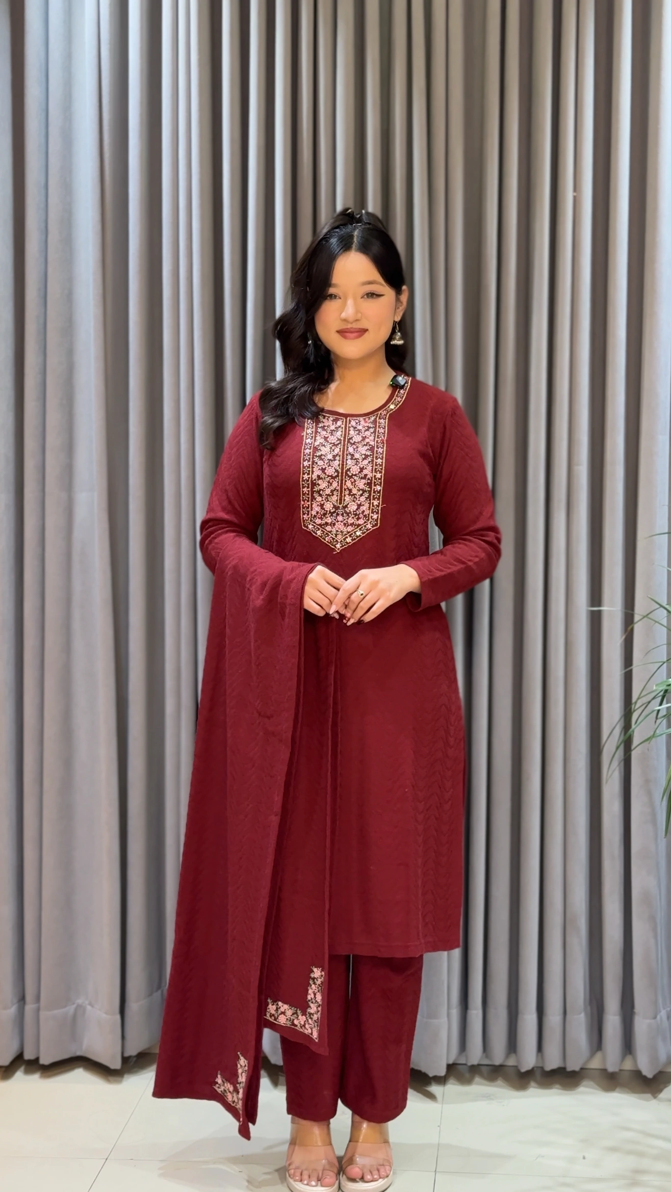 The kurta features a richly embroidered neckline that adds traditional sophistication and beautifully enhances the deep maroon tone. Paired with matching woolen pants and a coordinated woolen dupatta with subtle detailing, the ensemble presents a refined, cohesive, and season-ready look.