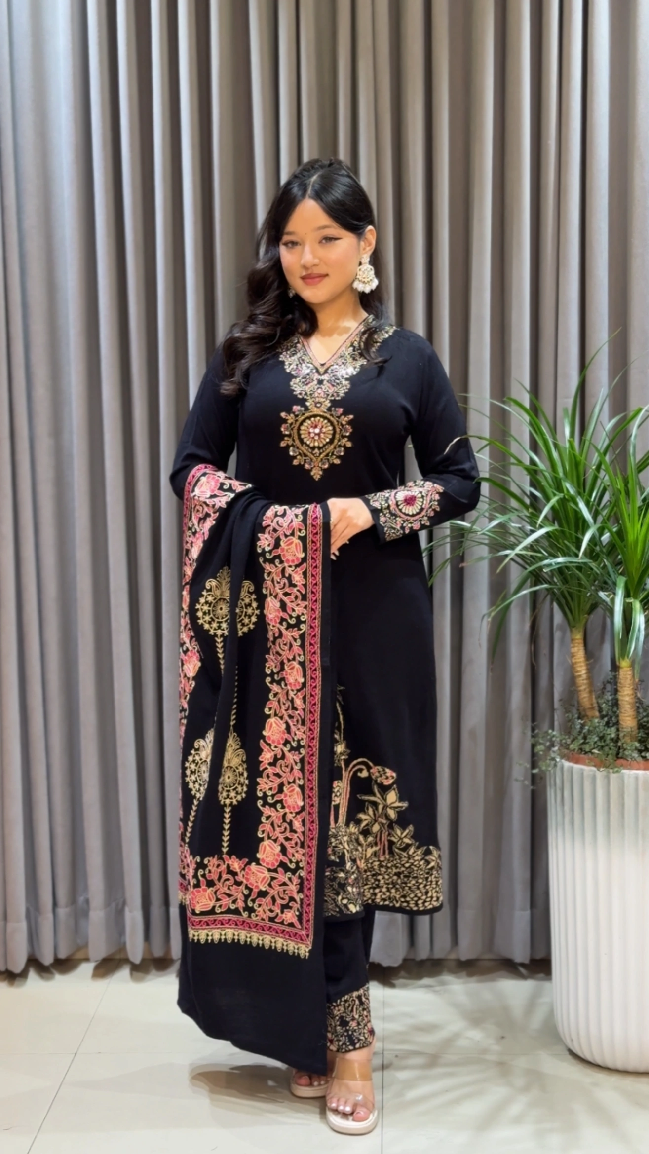This image beautifully captures a woman radiating elegance and confidence in a timeless black woolen embroidered set. Crafted from premium wool, this ensemble features a refined V-neckline adorned with delicate golden embroidery and elegant leaf motifs, creating a graceful and sophisticated focal point. The intricate threadwork continues along the sleeves and borders, showcasing masterful craftsmanship and classic allure. The deep black hue adds an aura of sophistication and poise, making it ideal for evening gatherings, festive occasions, and elegant winter wear.