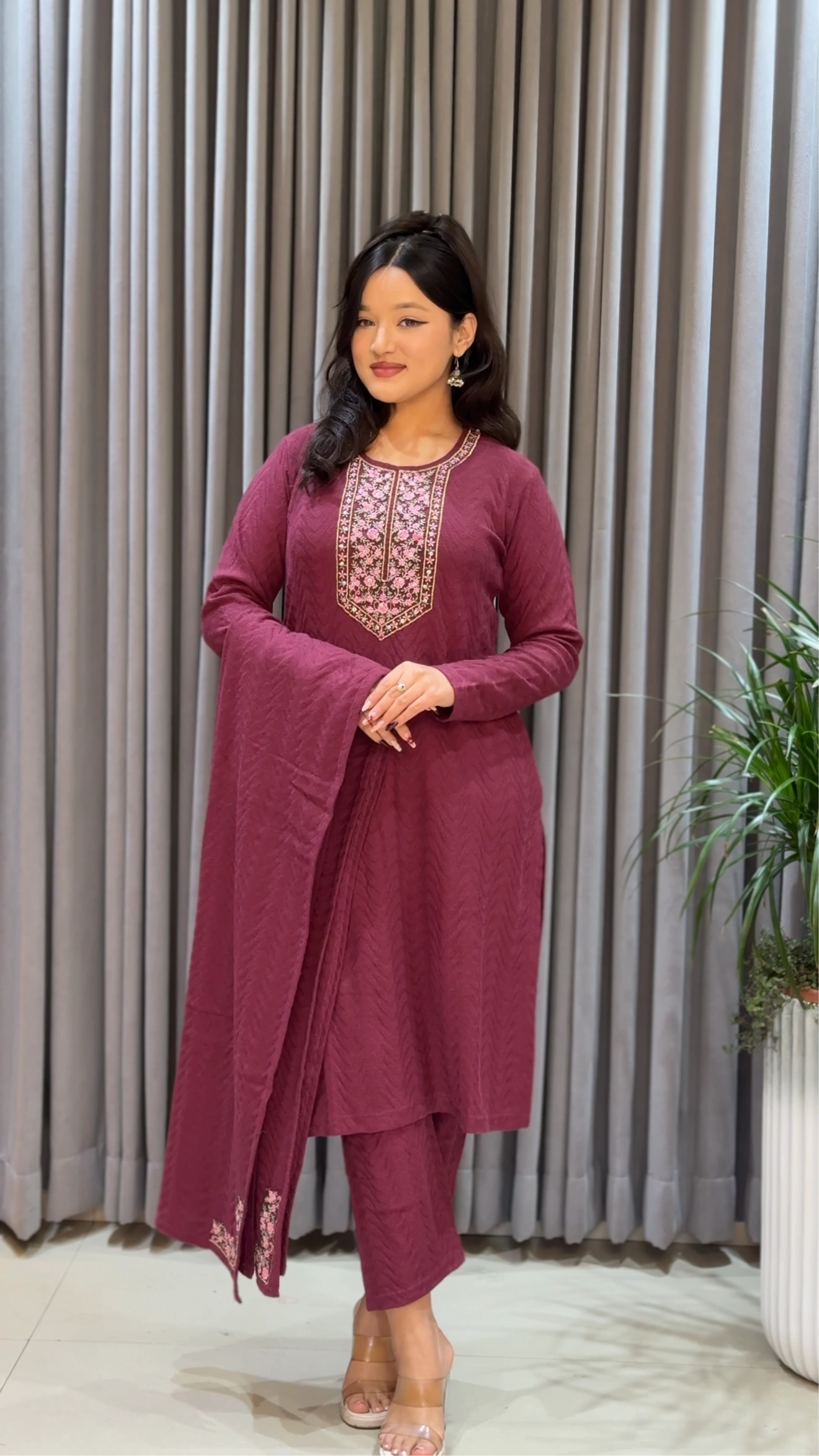 The kurta features a richly embroidered neckline that adds traditional sophistication and beautifully enhances the royal purple tone. Paired with matching woolen pants and a coordinated woolen dupatta with subtle detailing, the ensemble presents a refined, cohesive, and season-ready look.