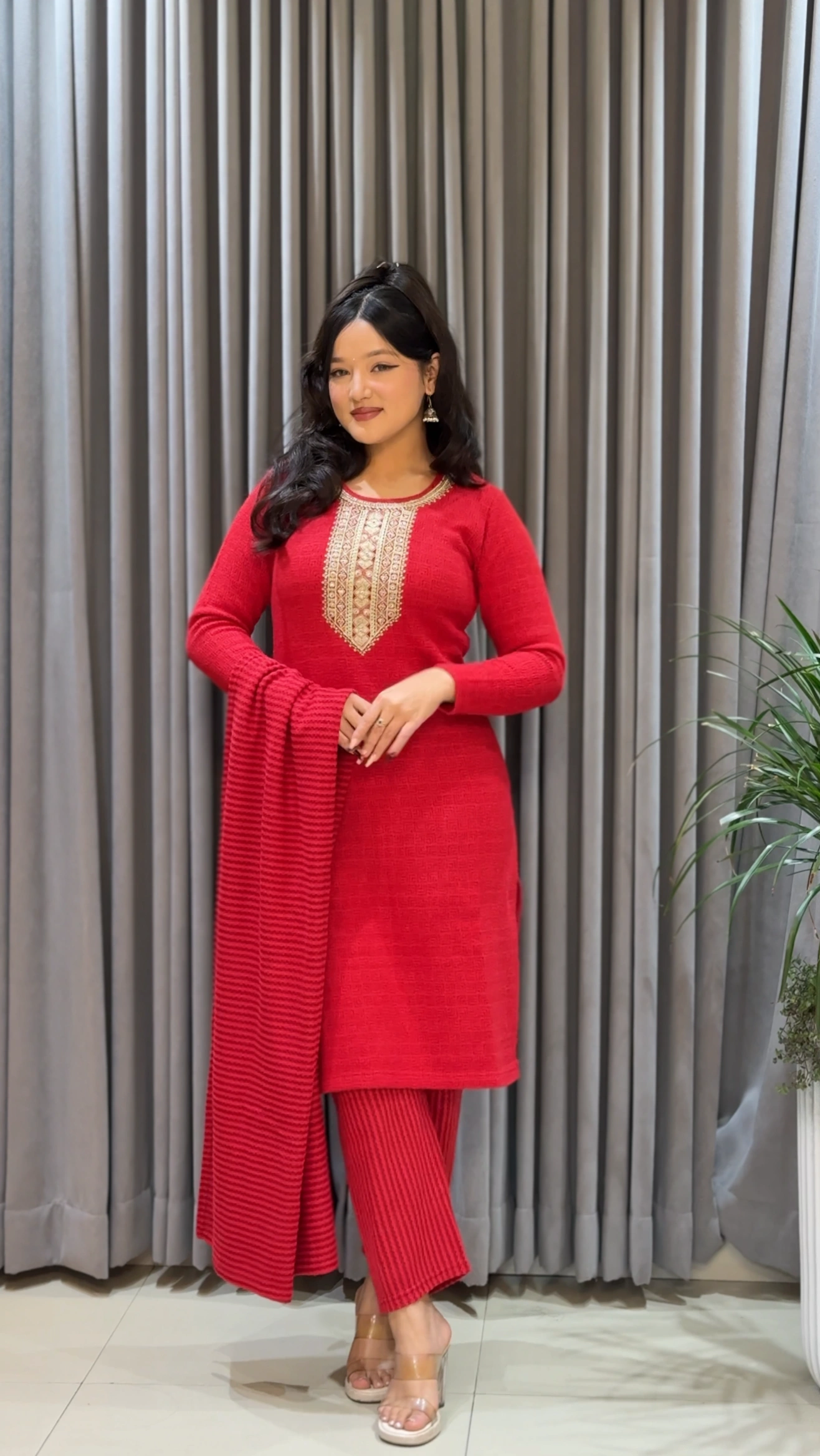 The kurta features a richly embroidered neckline that adds traditional sophistication and beautifully enhances the vibrant red tone. Paired with matching woolen pants and a coordinated woolen dupatta with subtle detailing, the ensemble presents a refined, cohesive, and season-ready look.