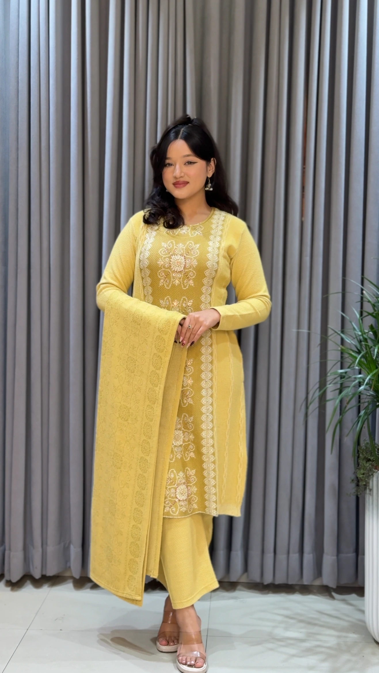 Perfect for women who value elegance, warmth, and comfort, this yellow woolen suit set is a versatile addition to any winter ethnic wardrobe.