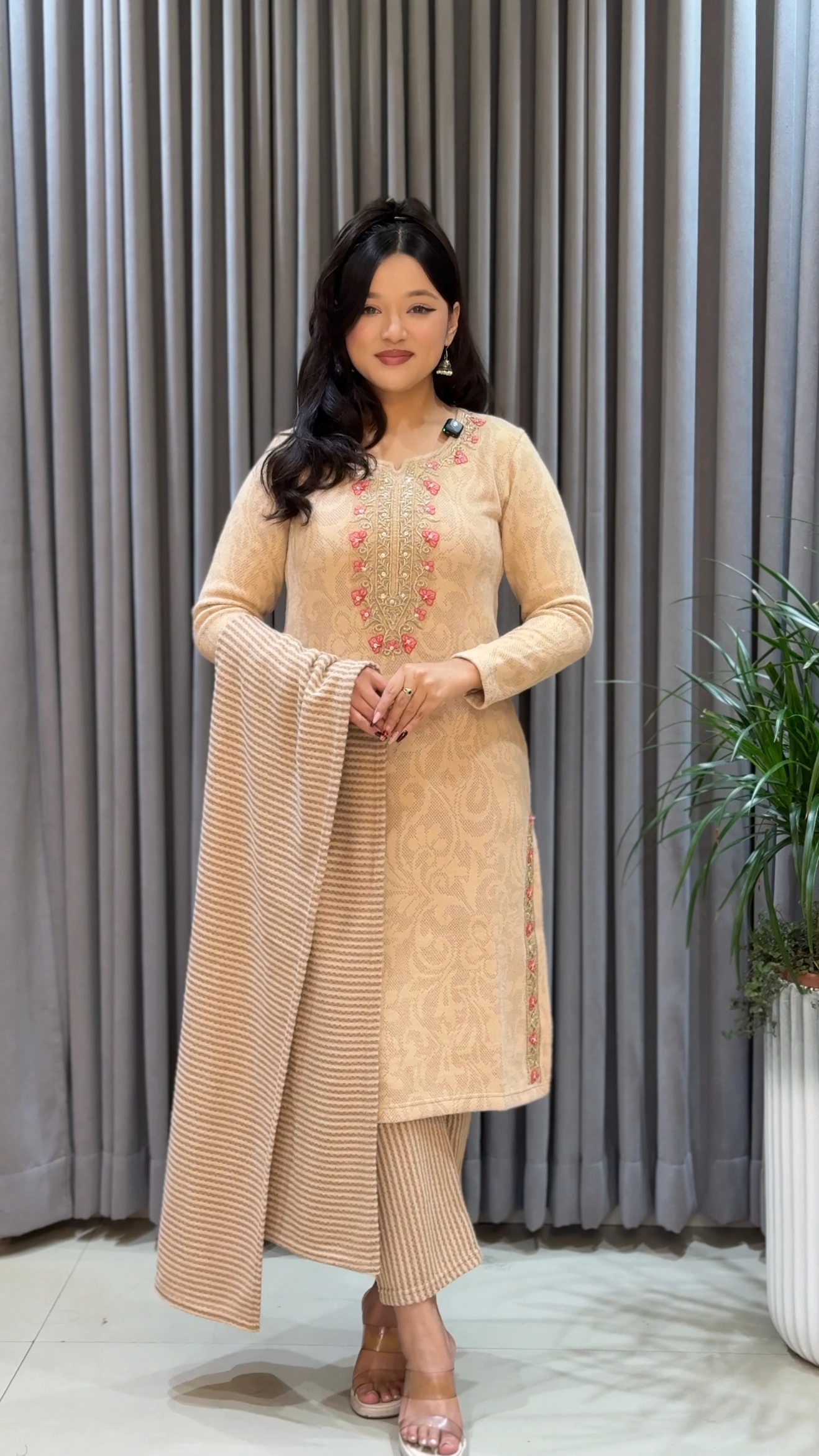 This elegant woolen suit set is designed to offer the perfect balance of winter warmth and timeless ethnic charm. Crafted from premium-quality woolen fabric, it provides a soft, cozy, and breathable feel—ideal for cold weather, festive celebrations, and everyday winter wear. The smooth texture and graceful fall ensure comfort without compromising on style.