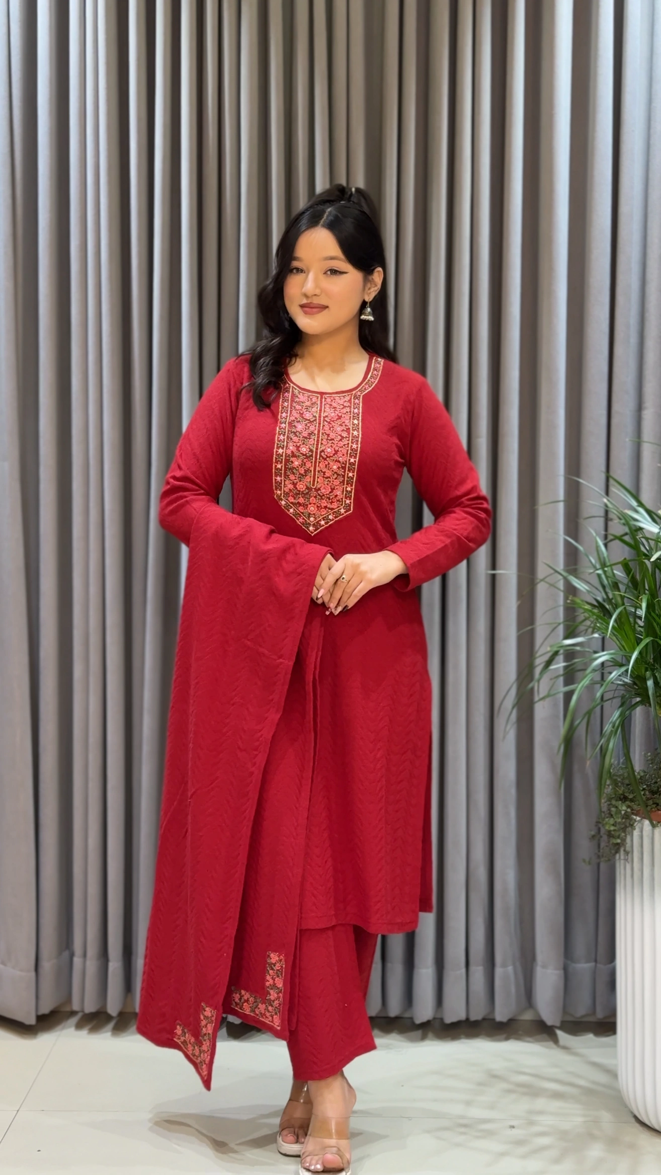 The kurta features a richly embroidered neckline that adds traditional sophistication and beautifully enhances the vibrant red tone. Paired with matching woolen pants and a coordinated woolen dupatta with subtle detailing, the ensemble presents a refined, cohesive, and season-ready look.