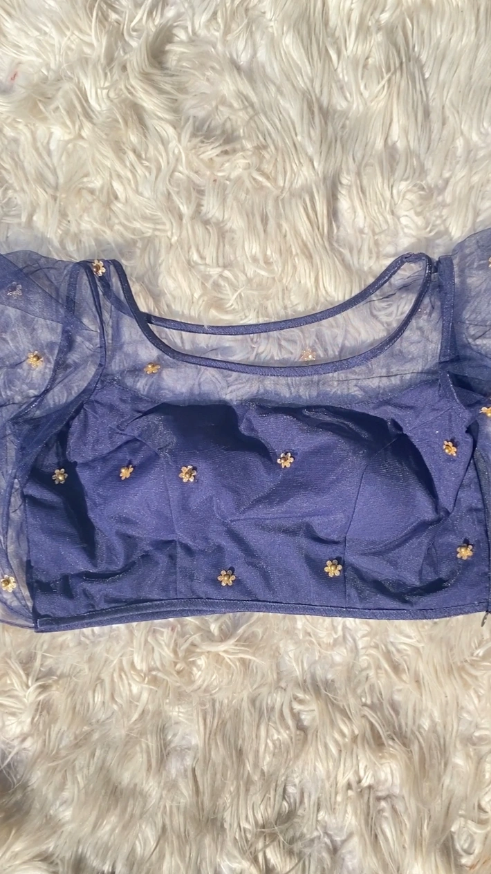 A sophisticated deep blue sheer blouse crafted with delicate golden floral embellishments for a refined festive look. The translucent fabric and elegant silhouette create a graceful balance of modern charm and traditional elegance, making it a perfect statement piece for special occasions.