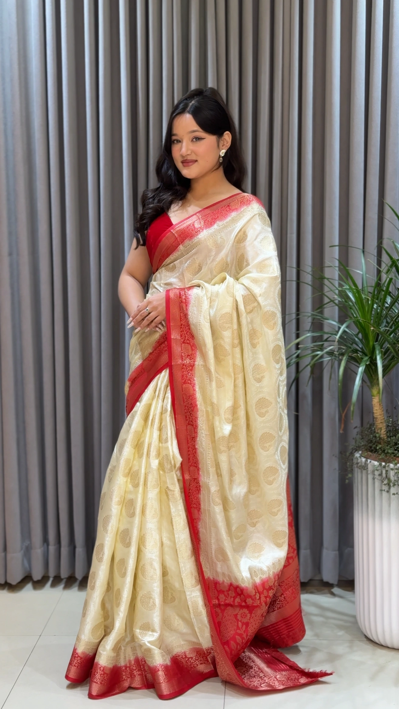 The saree features a stunning double-colour palette with a soothing lime-cream base blended beautifully with vibrant rose-red borders. The intricate zari-woven designs along the borders and pallu add depth, richness, and a touch of traditional grandeur. The lustrous silk texture enhances movement, creating a graceful and royal silhouette that stands out at any occasion.