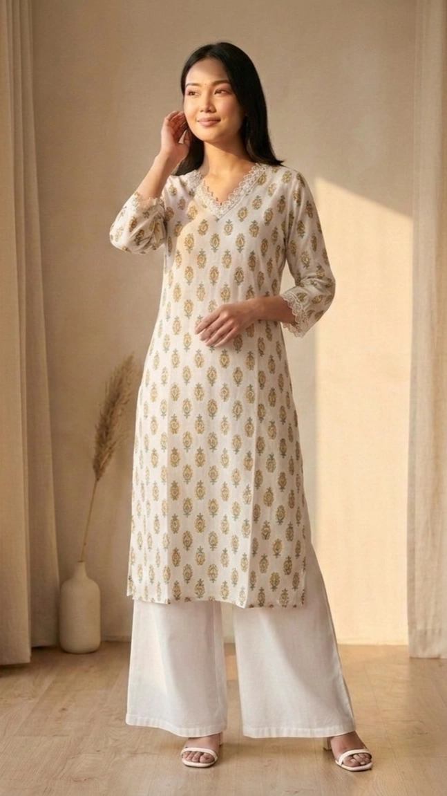 Graceful, minimal, and effortlessly elegant — the Parijat Kurthi is designed to bring timeless ethnic charm to your everyday wardrobe. Crafted in a soft ivory base with delicate golden traditional motifs, this kurthi reflects subtle sophistication inspired by classic designs.
