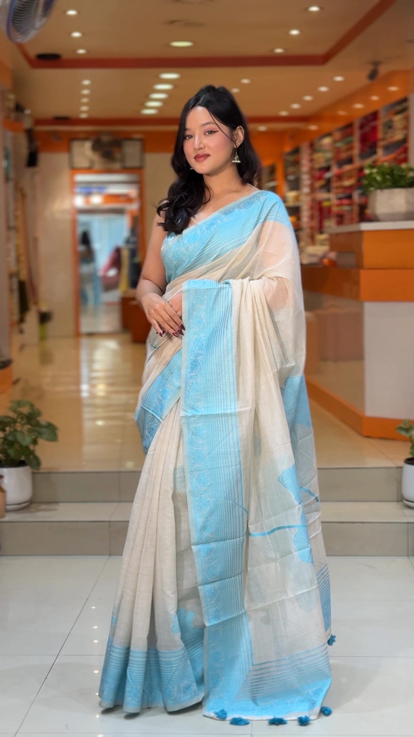 This image beautifully captures a woman exuding understated elegance in an exquisite ivory-toned premium linen saree adorned with serene blue borders and woven motifs. Crafted from high-quality linen, the saree offers a soft texture, graceful drape, and airy comfort — making it perfect for both everyday sophistication and festive occasions.